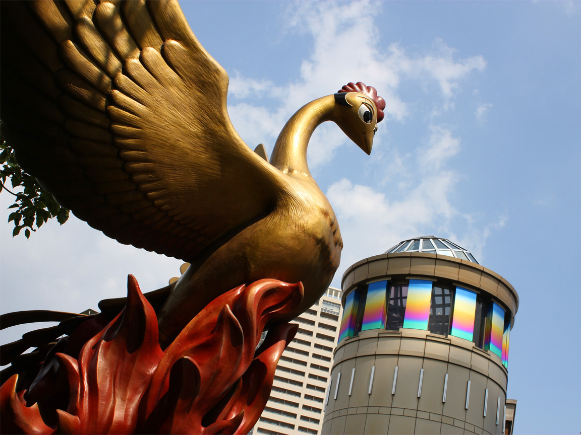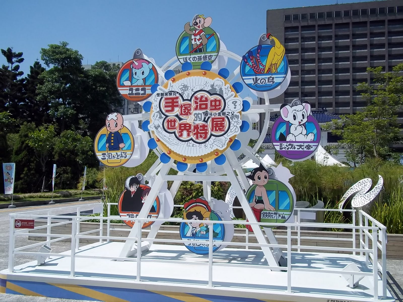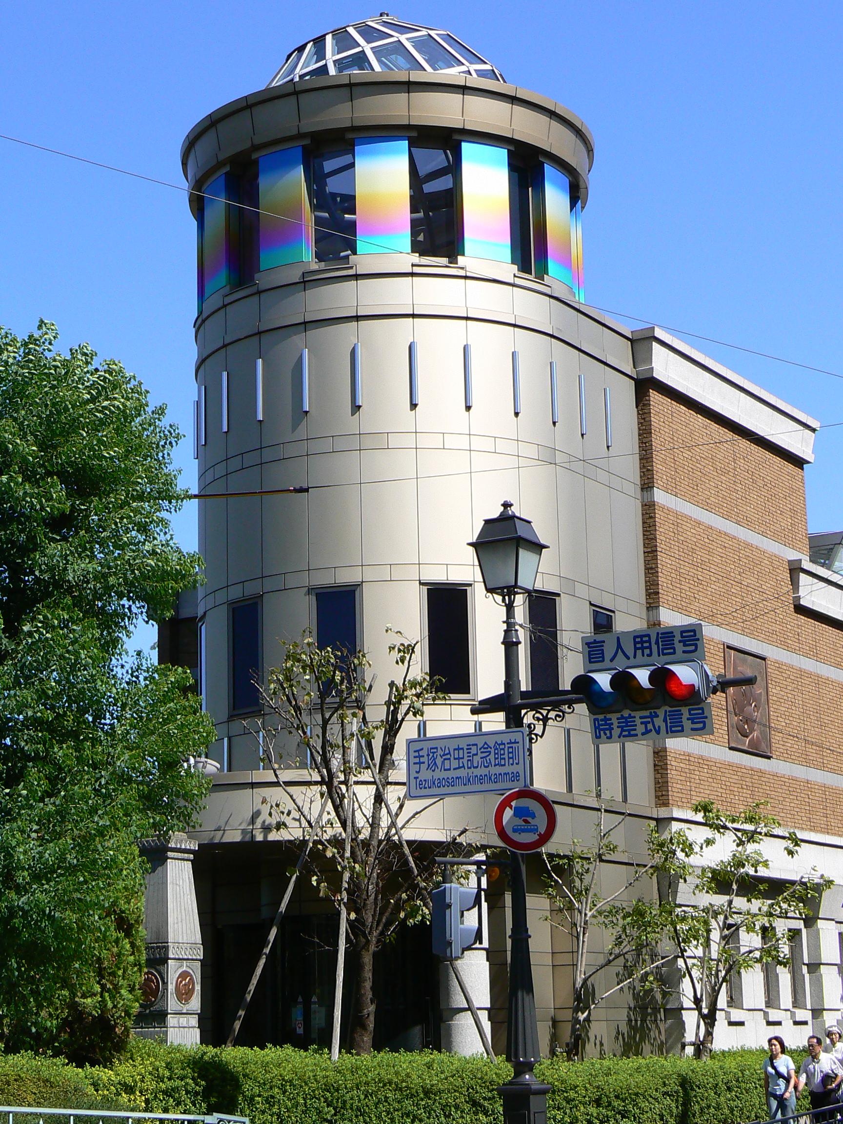 手塚治虫紀念館是一圓形建築。以透明玻璃地球為屋頂,窗戶嵌有鮮豔的彩色玻璃,為當地最突出的地標。入口處是一座金色的「火鳥」雕塑,水泥地面及紀念館的外牆上嵌上手塚著名作品中的漫畫人物。
