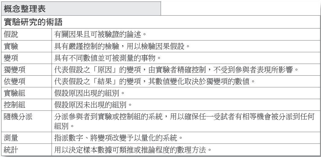 二、實驗法 實驗法(experiment)對假設的因果關係進行最嚴格的檢驗。研究者嚴格控制實驗情況,通常在實驗室進行測量,以便發現變項之間的因果關係。 實驗法對變項進行精確控制。 實驗法的另一項重要特點是將參與者隨機分派到各組或各種實驗情況,隨機分派(random assignment)意指每位參與者被分派到任一組別的機率相同。