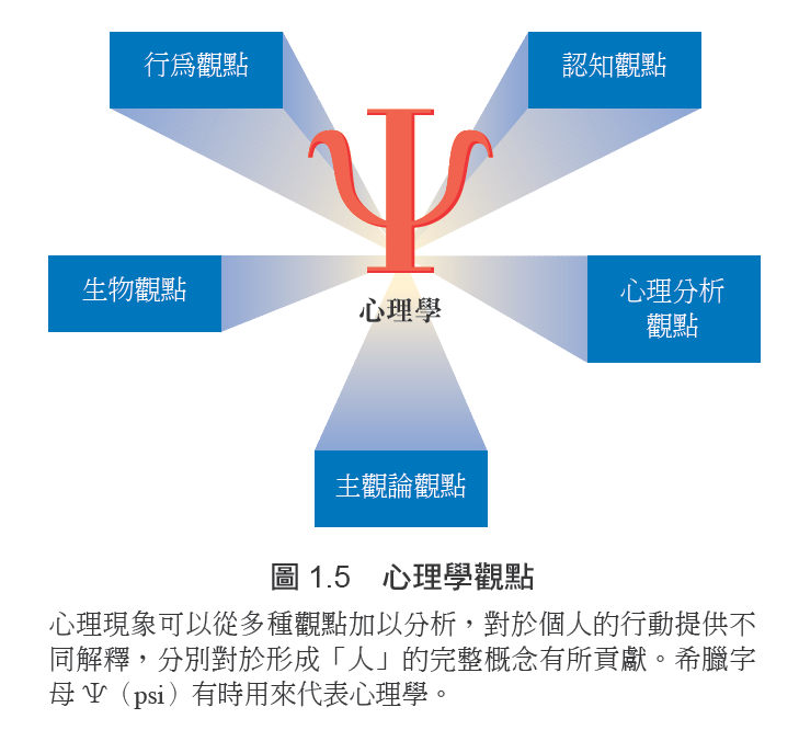 一、生物觀點(biological perspective)研究想要具體指出行為與心智歷程之下的神經生物歷程。 二、行為觀點(behavioral perspective)關心外顯、可觀察的刺激與反應,認為所有行為都是制約與增強的結果。