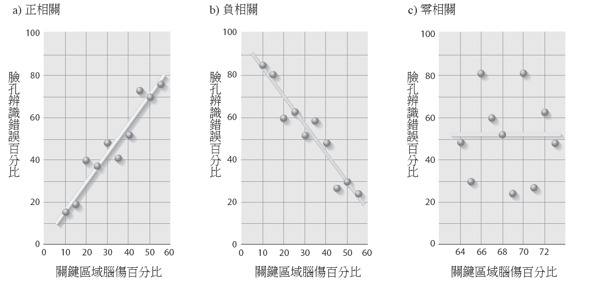 三、相關法 相關法可以檢驗某些未能控制的變項是否與我們關心的變項有關(或相關)。 相關係數的符號是r,數值介於-1.00 到+1.00 之間。數值大小代表相關程度,正負號表示相關方向。 相關係數為正值表示兩個變項為正相關(positively correlated),即兩個變項同時增加或同時減少;若相關係數為負值,則表示負相關(negatively correlated)。