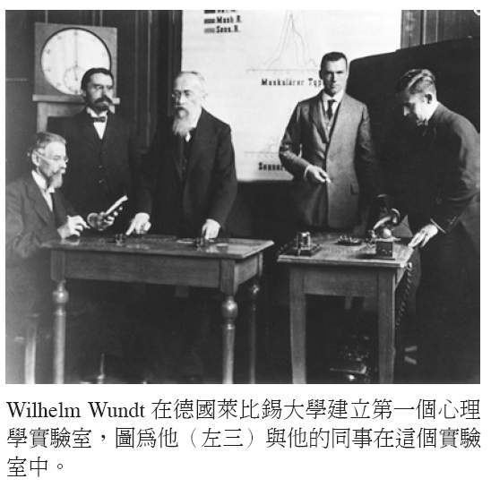 二、科學心理學的開端 Wilhelm Wundt 在1879 年於德國萊比錫大學創立第一個心理學實驗室 Wundt 仰賴內省法(introspection)來研究心智歷程,意指觀察並記錄自己的知覺、思考和感受 仰賴內省法有時是行不通的。即使經過密集訓練,人們對簡單感覺經驗(快速)的內省結果差異仍然很大,無法得到共識