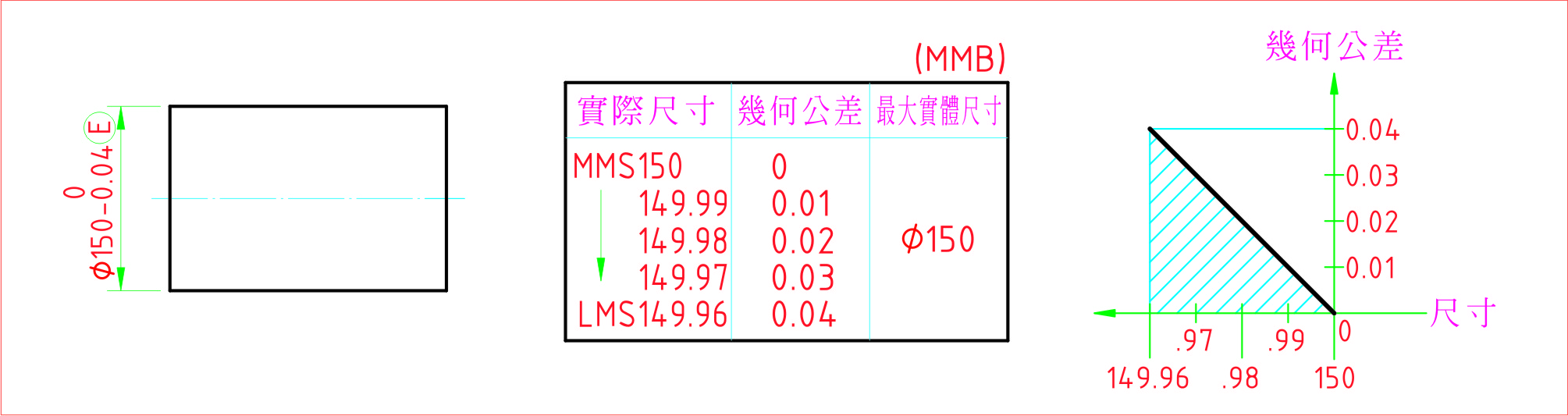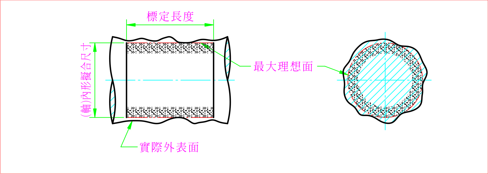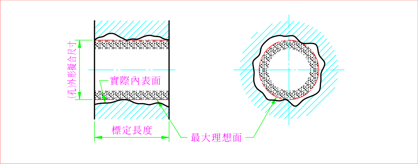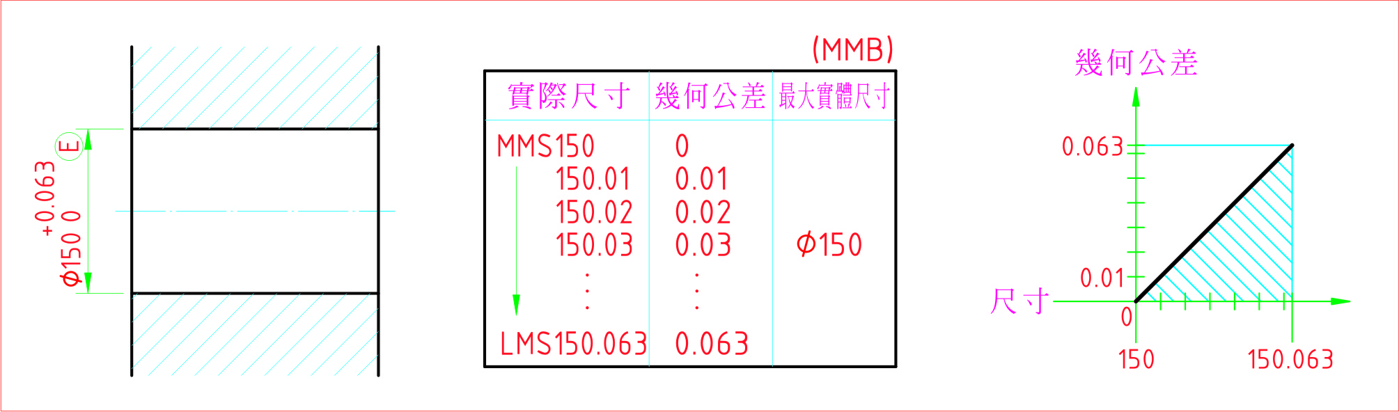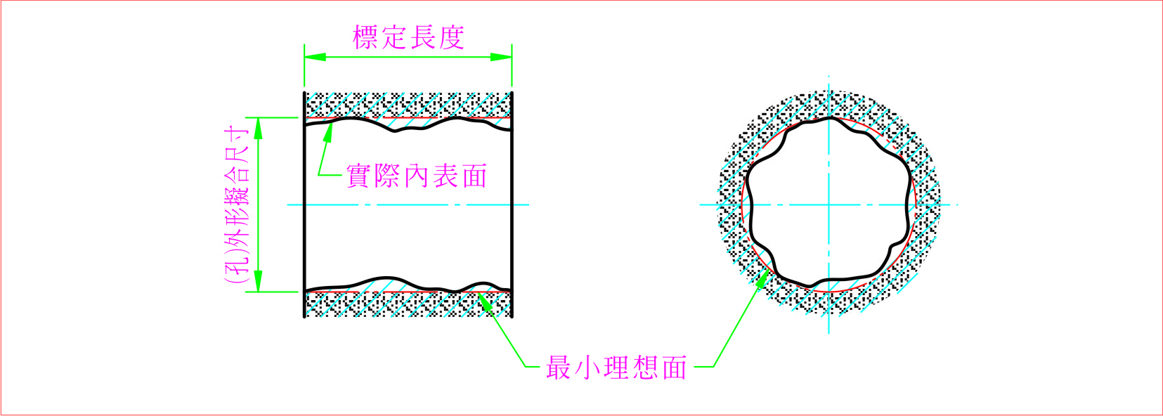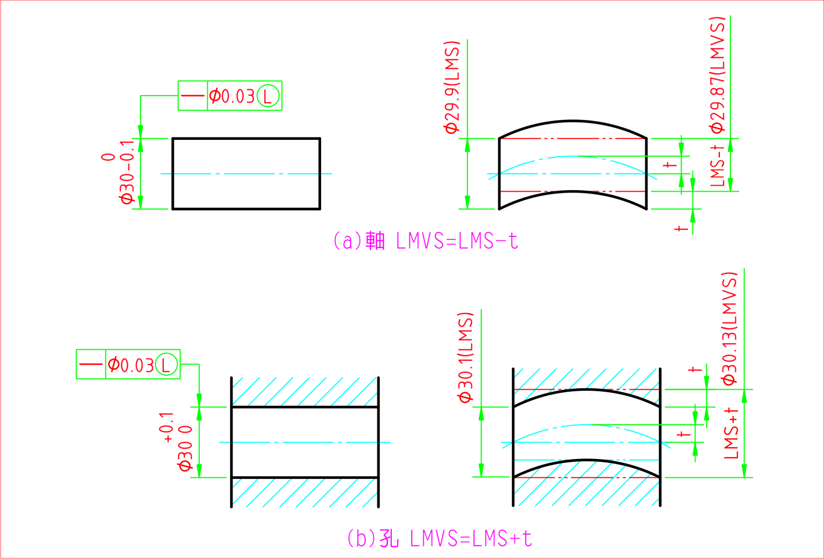 尺寸形態的實際實效尺寸,不得超出最小實體實效尺寸(LMVS)。亦即當實際尺寸從最小實體尺寸向最大實體尺寸偏離時,允許被測形態的幾何公差值增大。