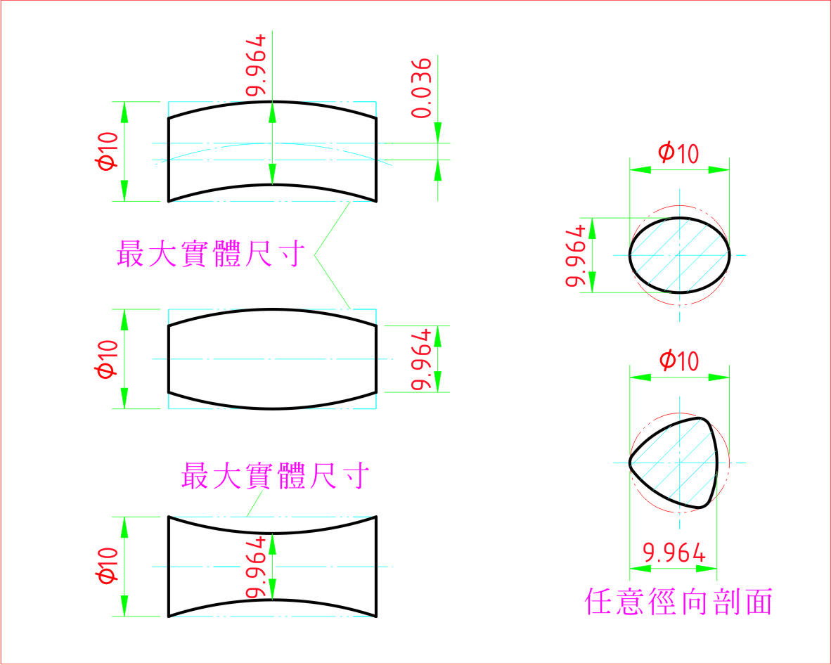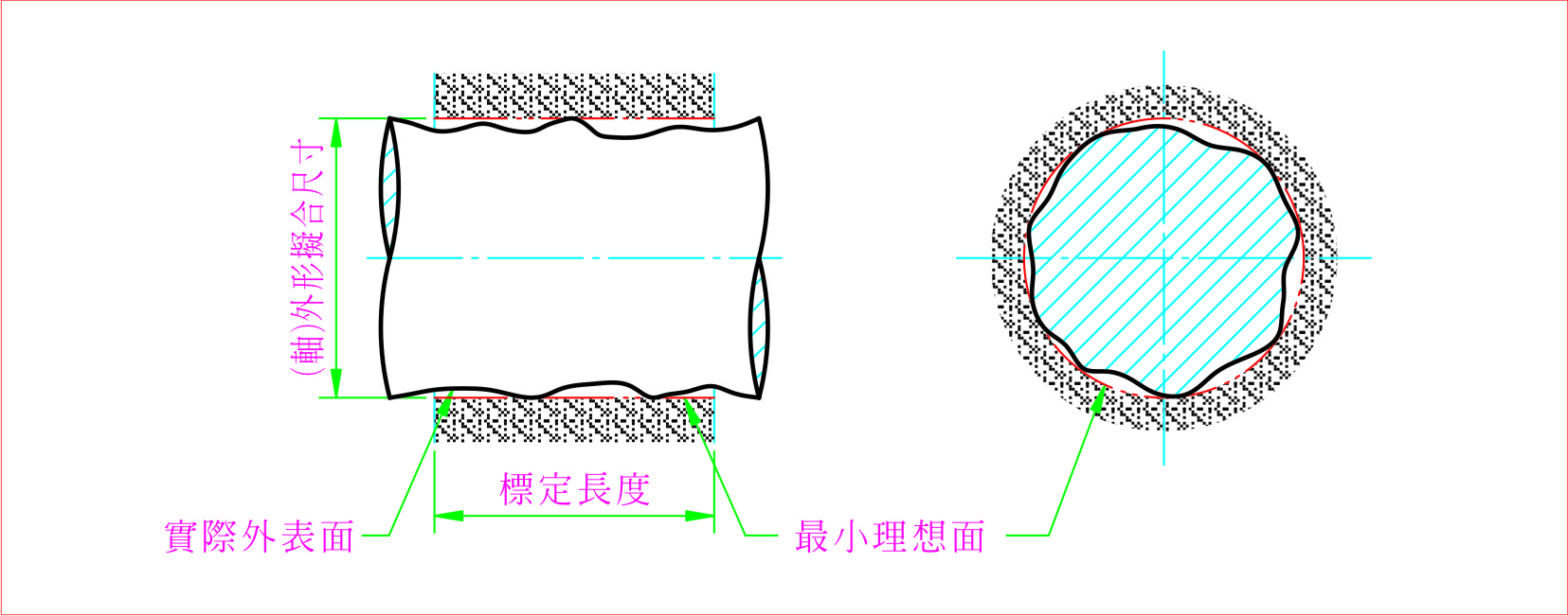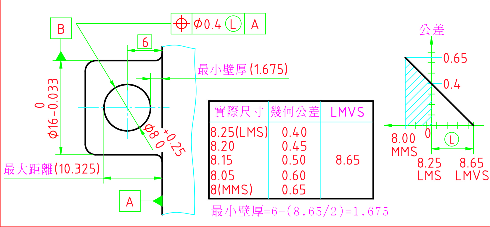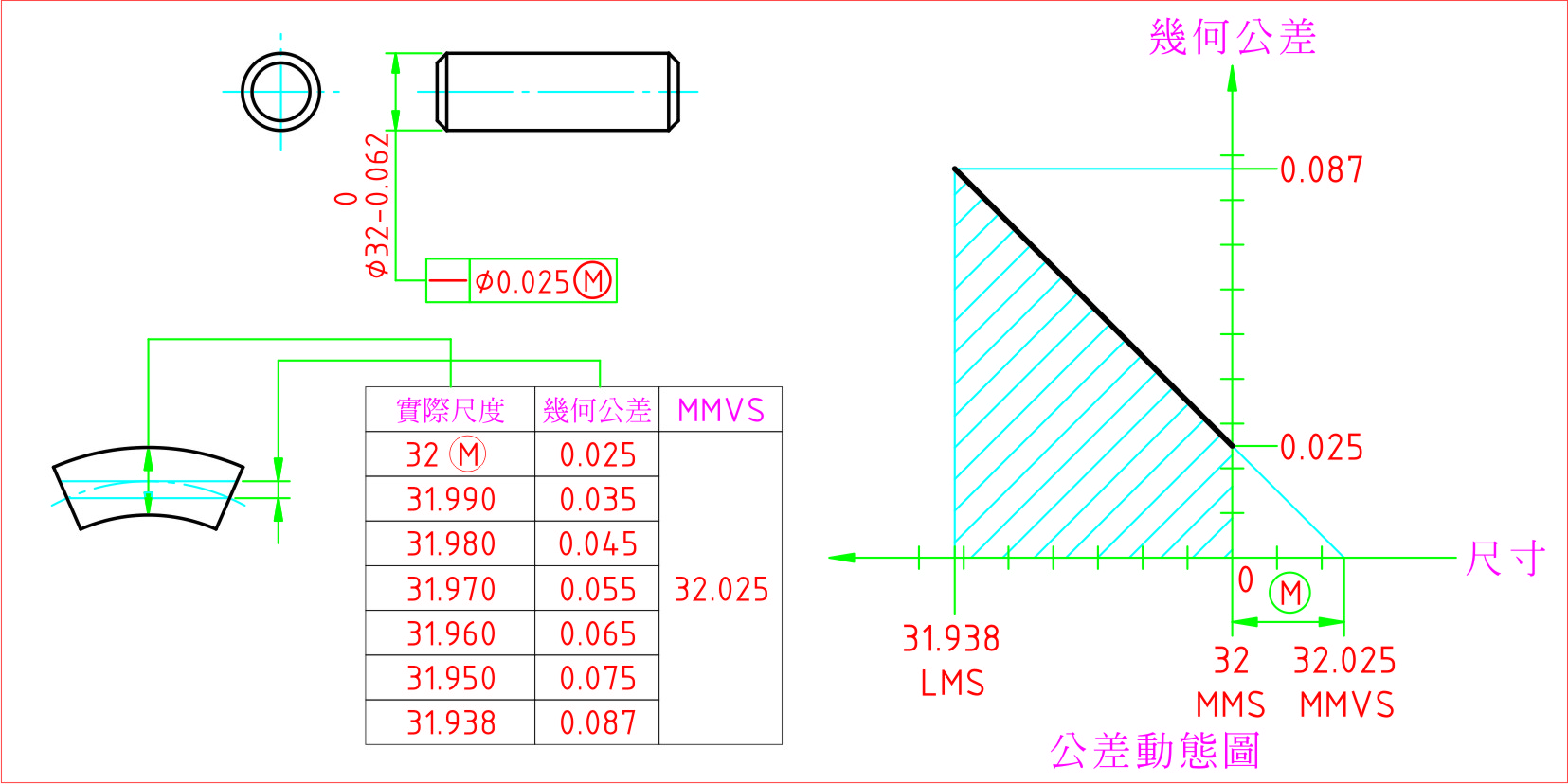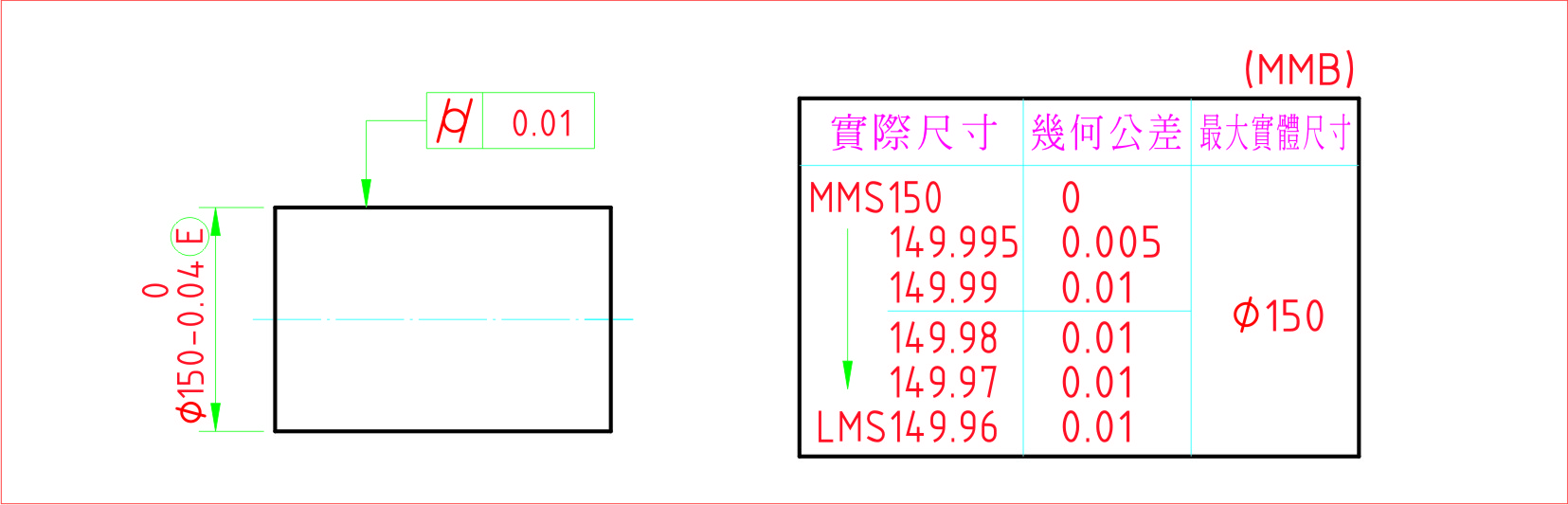 尺寸形態的實際實效尺寸,不得超出最小實體實效尺寸(LMVS)。亦即當實際尺寸從最小實體尺寸向最大實體尺寸偏離時,允許被測形態的幾何公差值增大。