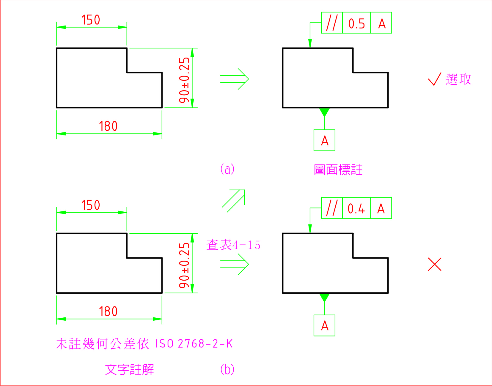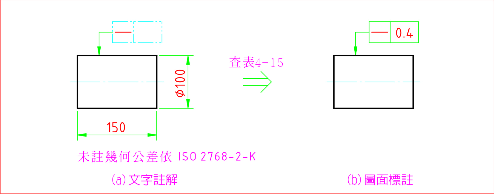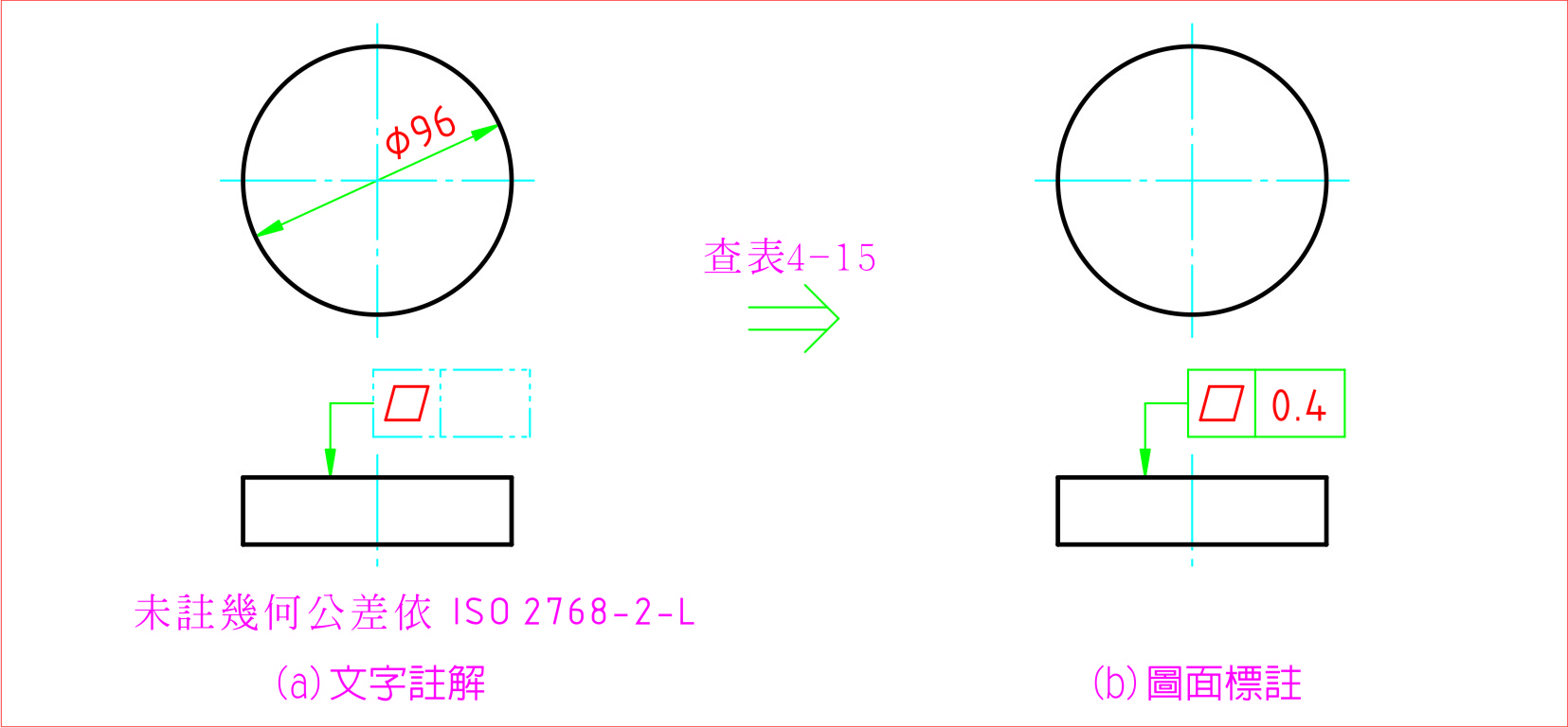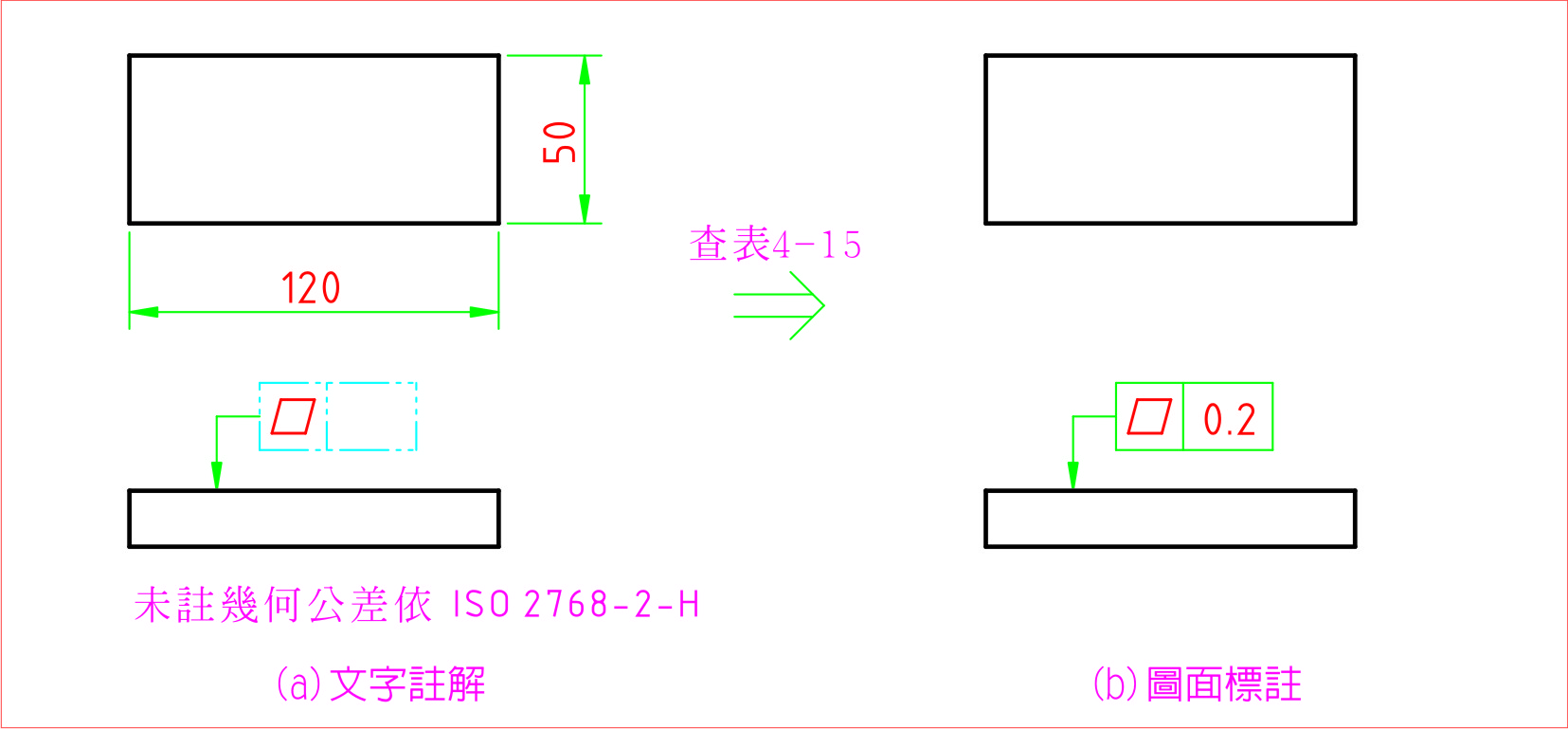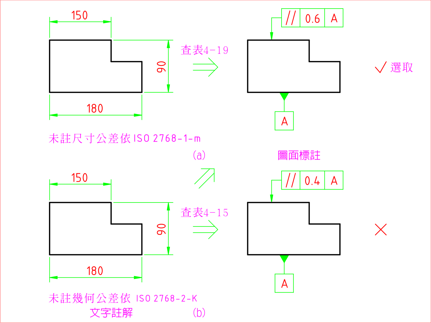 若如圖4-86所示,兩平行平面間之尺寸公差依 ISO2768-1-m,查表4-19其平行度未註公差值為0.6mm如圖(a),再依ISO2768-2-K查表4-15,其平行度未註公差值為0.4mm如圖(b),以取其較大者,所以未註平行度公差值應選取0.6mm。 100 圖4-86平行度(三) 兩者取較大者
