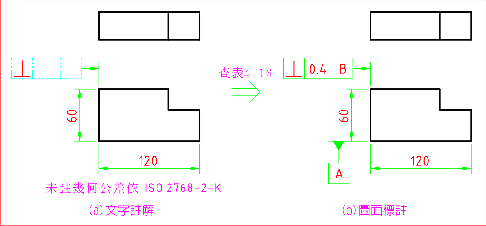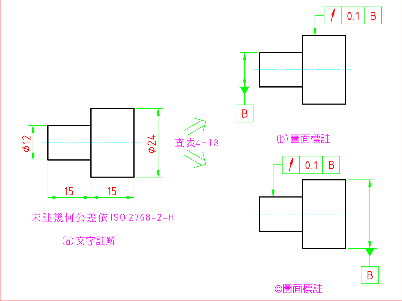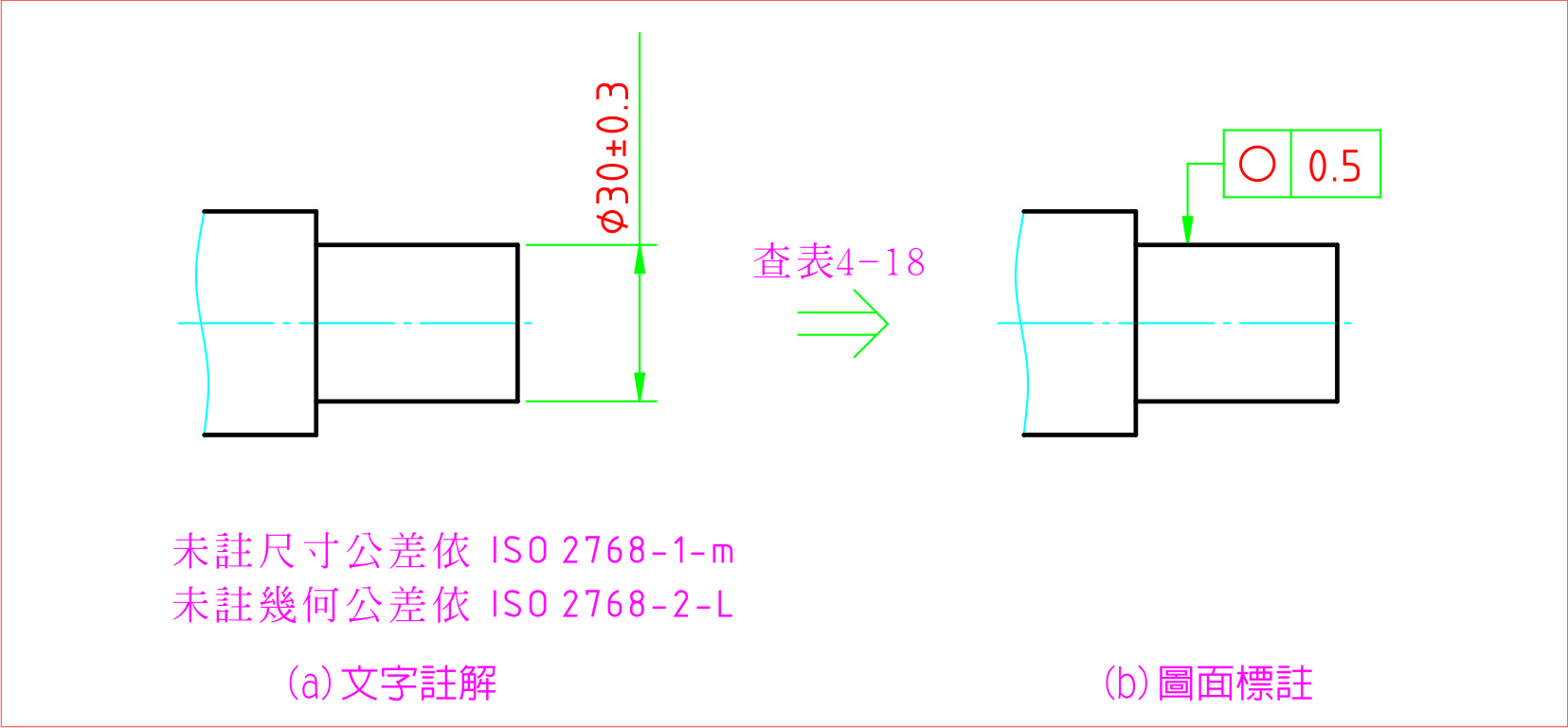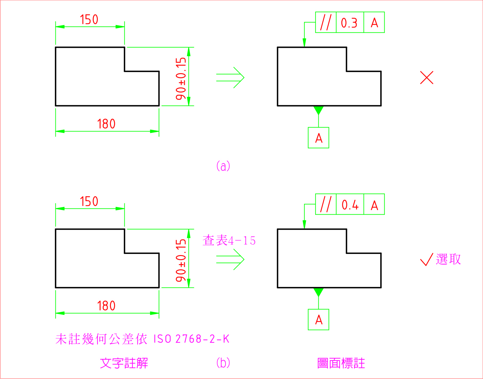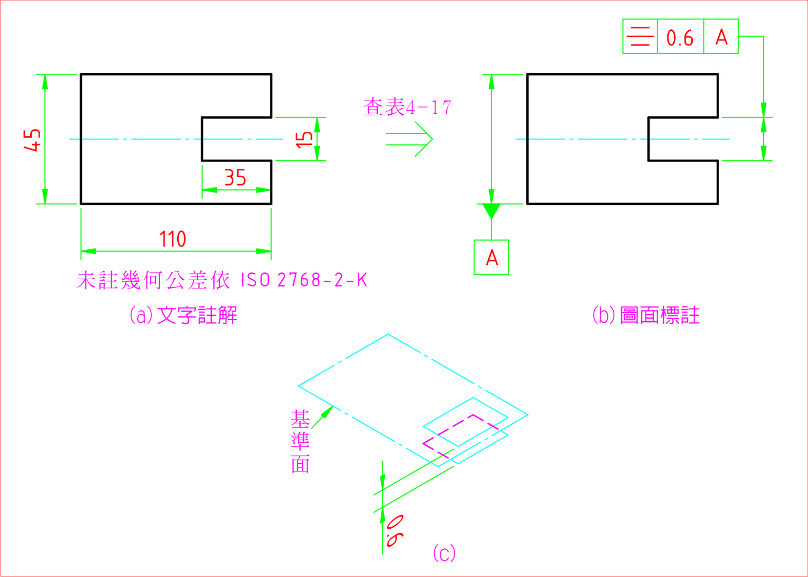 若如圖4-86所示,兩平行平面間之尺寸公差依 ISO2768-1-m,查表4-19其平行度未註公差值為0.6mm如圖(a),再依ISO2768-2-K查表4-15,其平行度未註公差值為0.4mm如圖(b),以取其較大者,所以未註平行度公差值應選取0.6mm。 100 圖4-86平行度(三) 兩者取較大者
