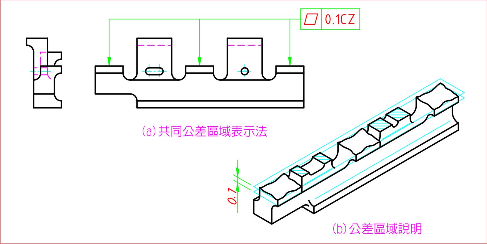 所謂共同公差區域,是指同時控制多個分開的被測形態,誤差變動範圍在同一公差區域。 16 圖4-13共同公差區域 三個分開的平面形態,如同在同一平面內的精度要求