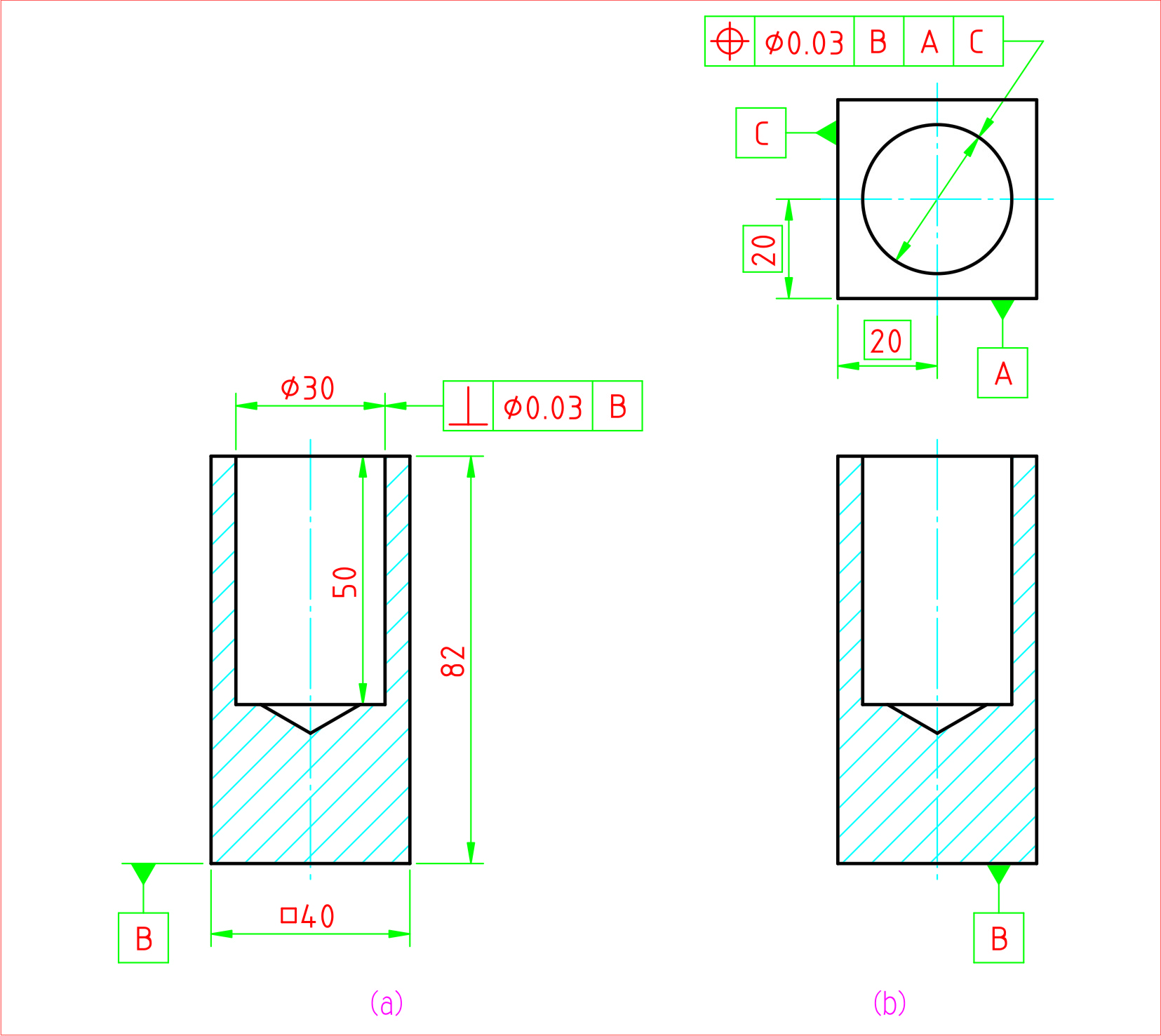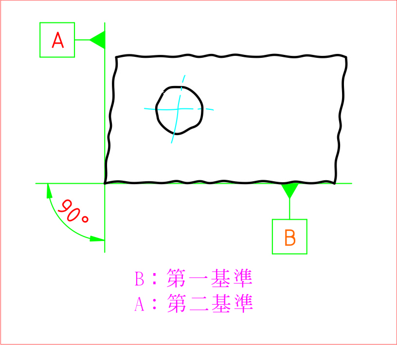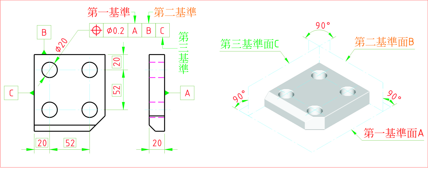 基準是確定被測形態公差區域方向與位置的依據;同時亦是評定被測形態方向和位置誤差的依據。所以在方向公差、位置公差、偏轉度公差的幾何公差框格一定要有第三格或更多格,並標註基準代號字母。