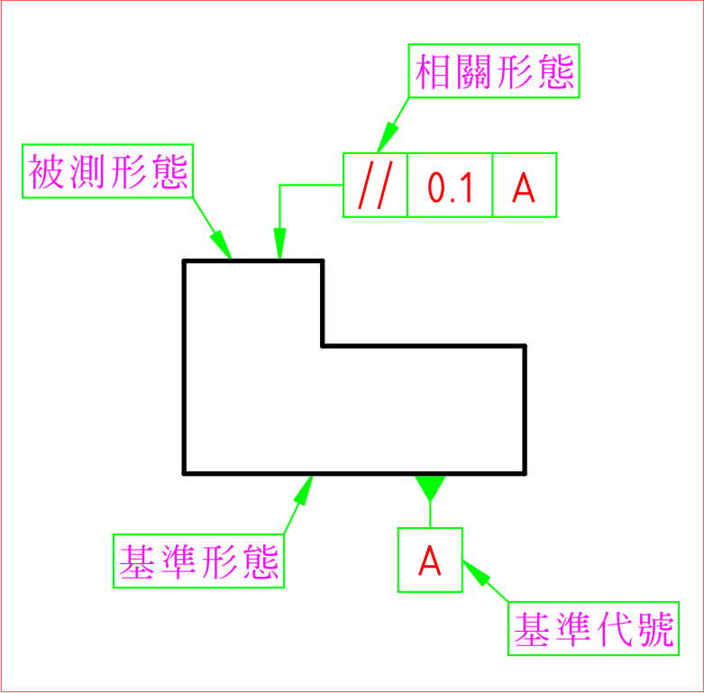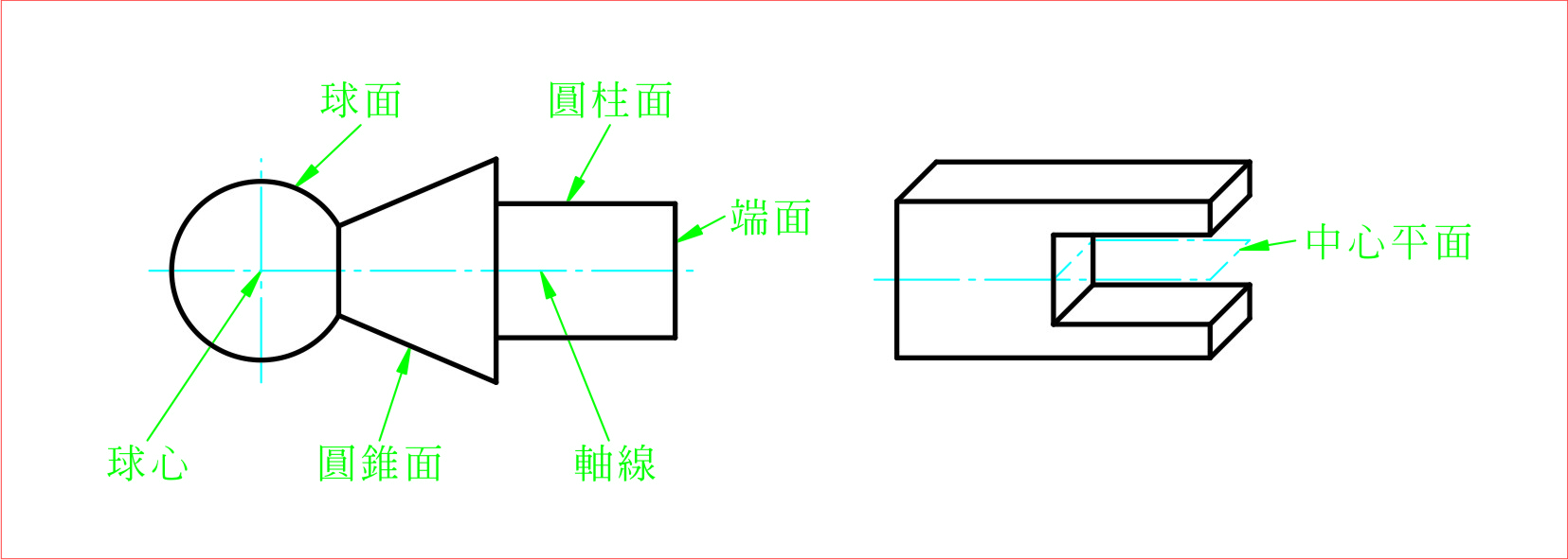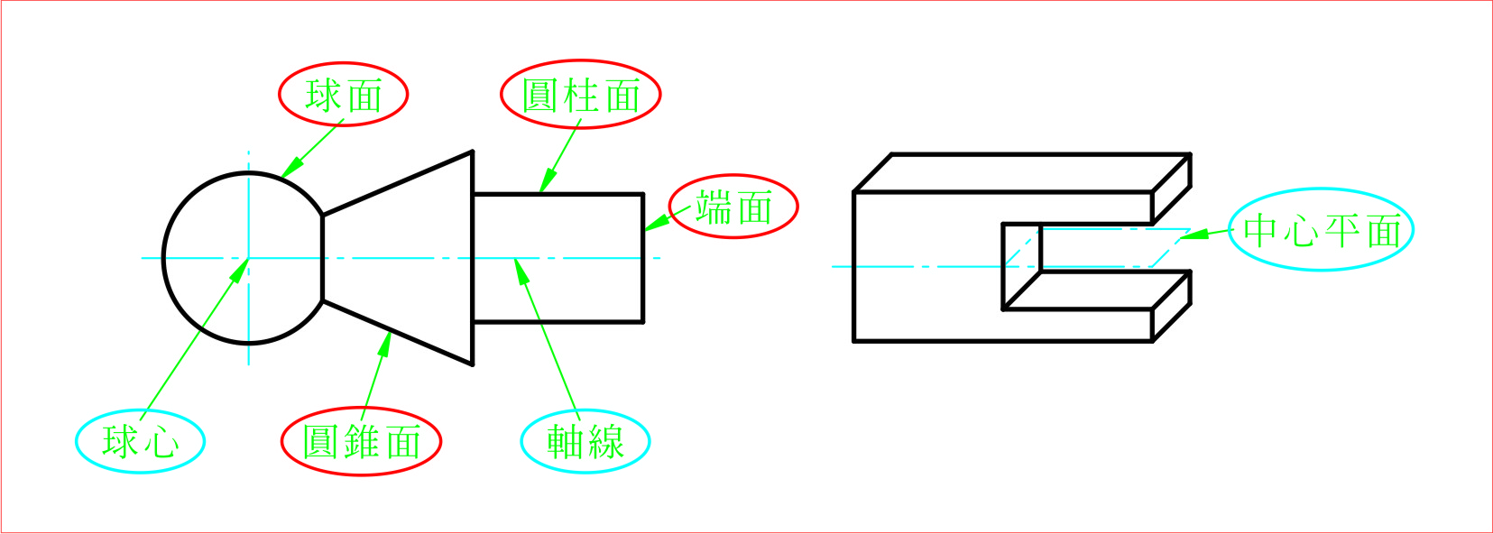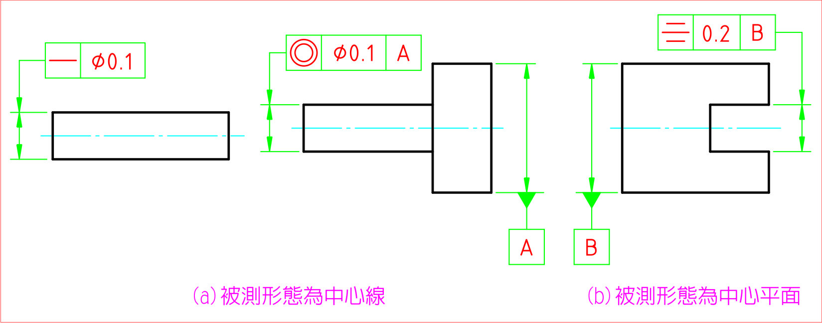 (2)導出形態(derived feature)(舊制稱為中心形態):是非物理性存在東西,是由一個以上的組成形態的關係所假想的形態。是須經實際零件量測結果才能判斷得到的。例如:圓心、球心、中心線、中心平面。 5