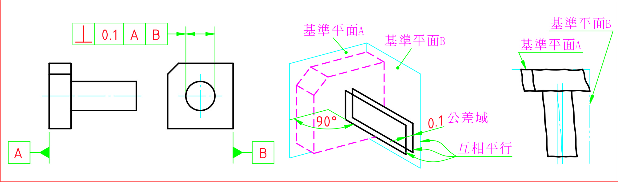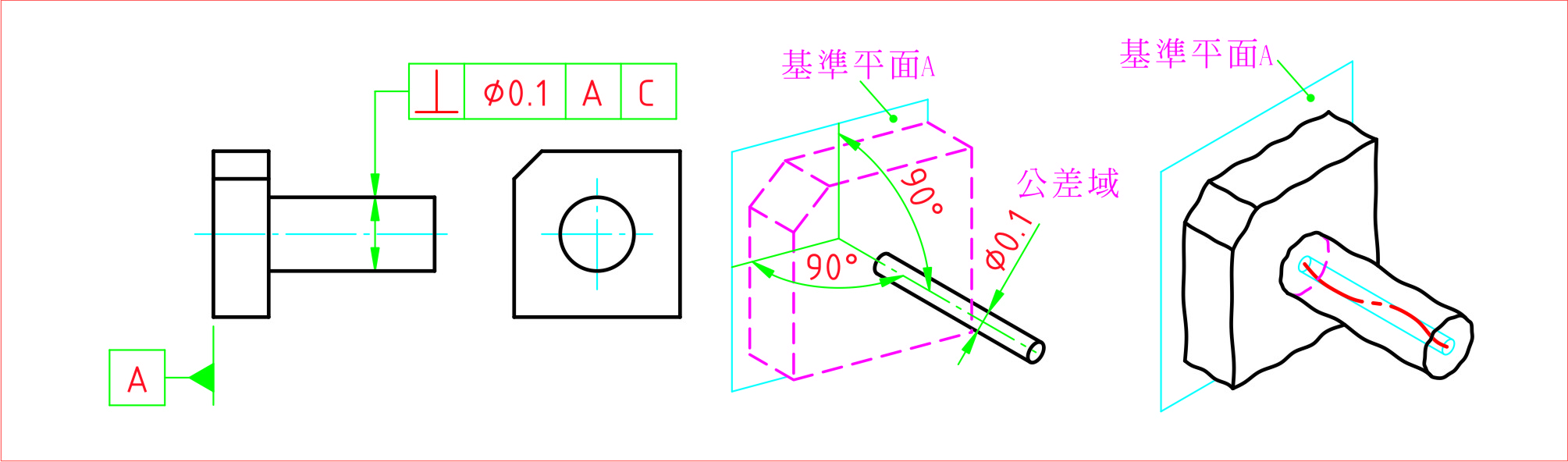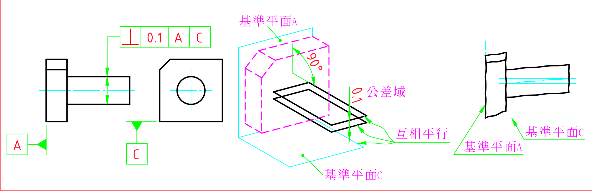 (2)導出形態(derived feature)(舊制稱為中心形態):是非物理性存在東西,是由一個以上的組成形態的關係所假想的形態。是須經實際零件量測結果才能判斷得到的。例如:圓心、球心、中心線、中心平面。 5