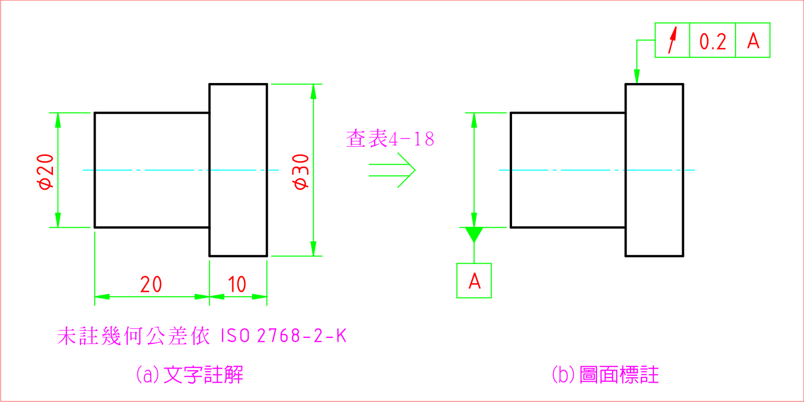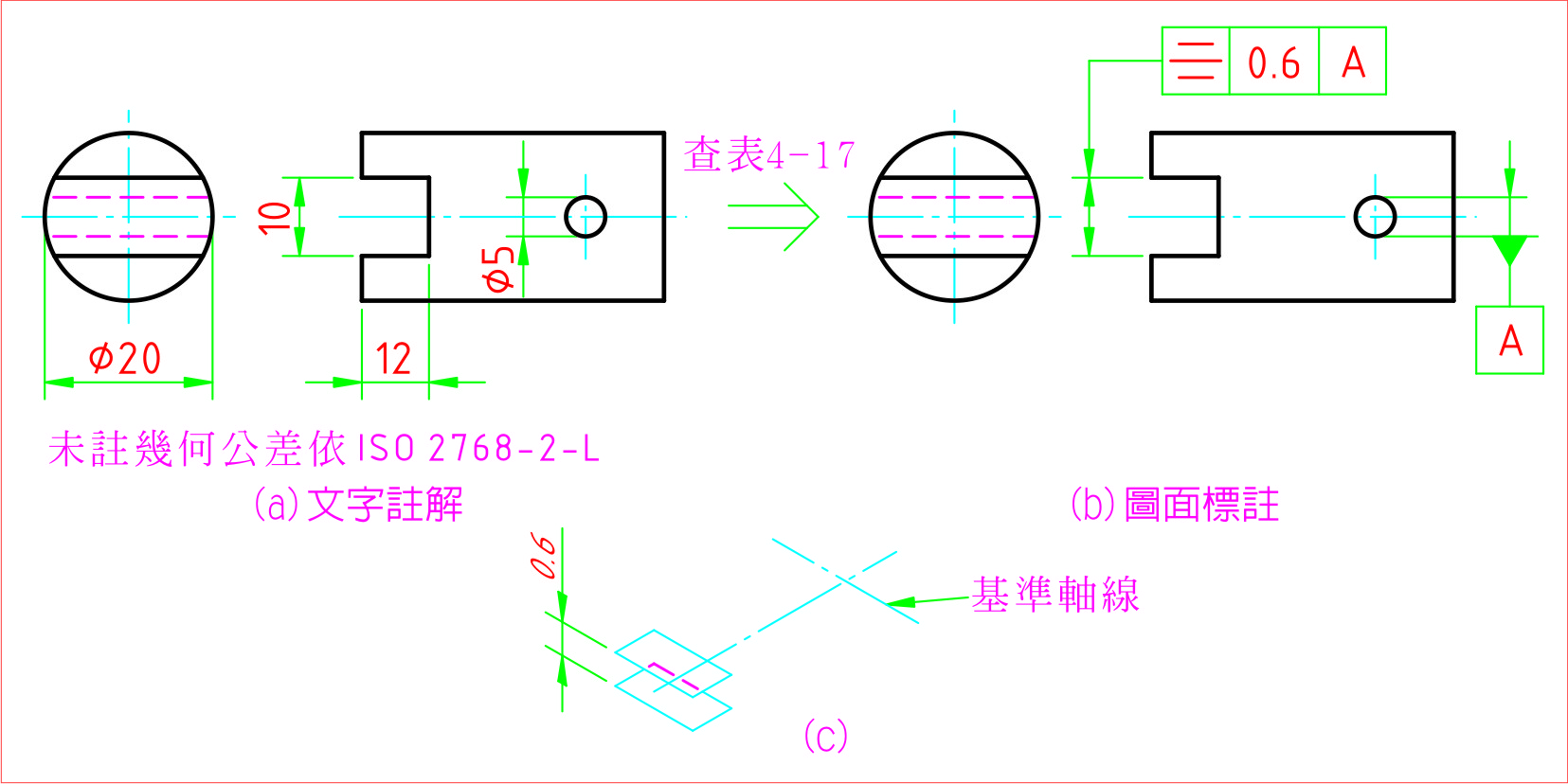 (ISO2768-2) mm 圖4-92圓偏轉度(二) 圖4-91圓偏轉度(一) 取較長的20mm為基準 兩者等長,任選其一為基準