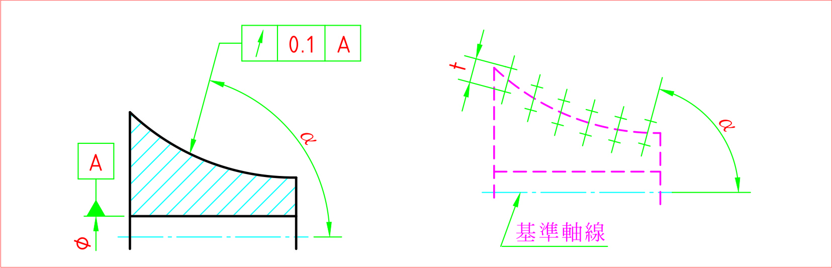 公差區域的方向,原則上,箭頭指向應與被測形態公差區域方向一致。也就是公差區域的寬度(t)方向垂直於被測形態的表面,如圖4-30所示。若另有規定除外,如圖4-31,引線與基準軸線A之間規定的夾角α,確定了公差區域的寬度(t)方向。 41 圖4-31 公差區域寬度方向以α角規定 圖4-30 公差區域寬度方向垂直於被測形態表面
