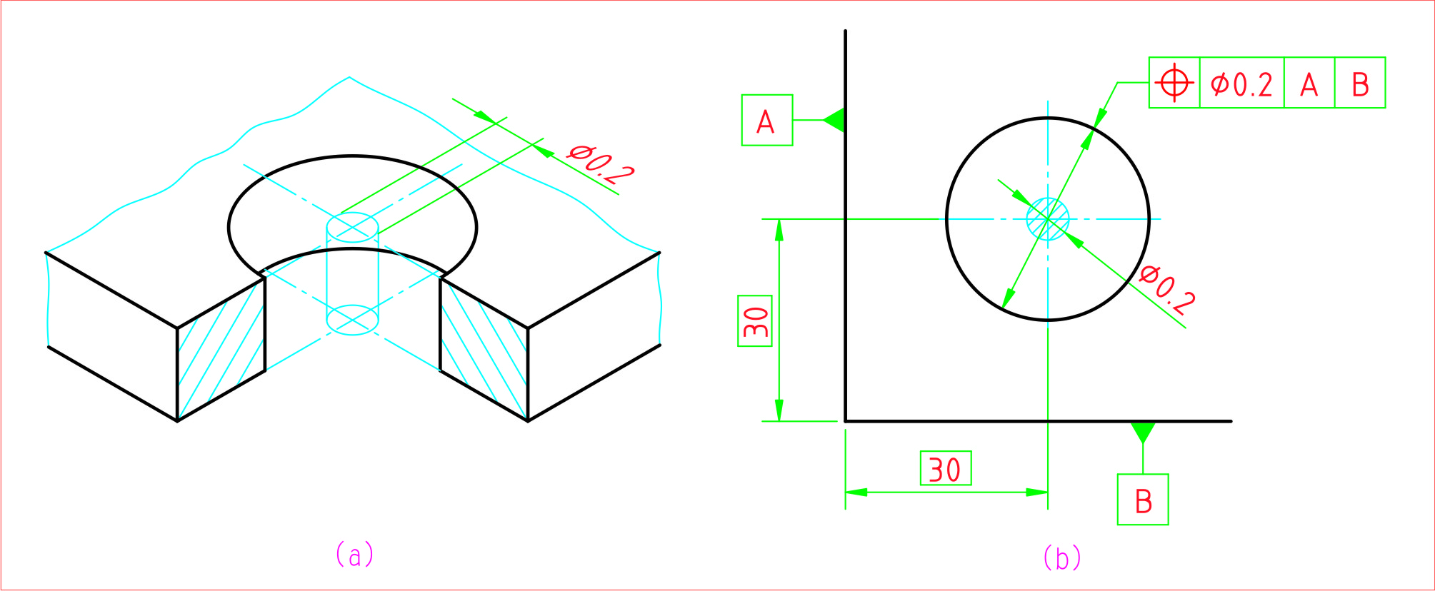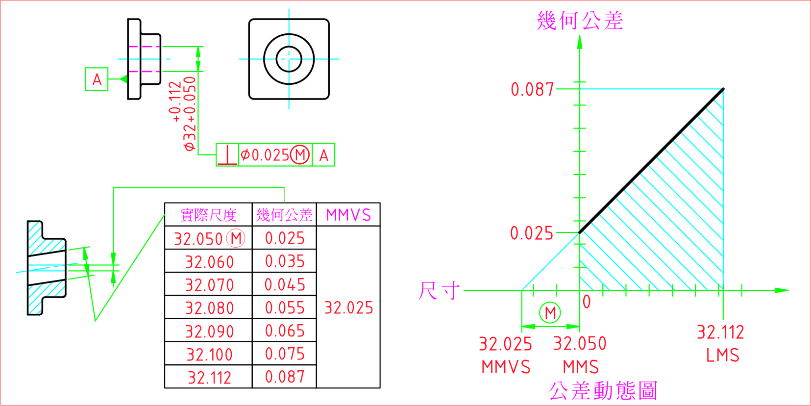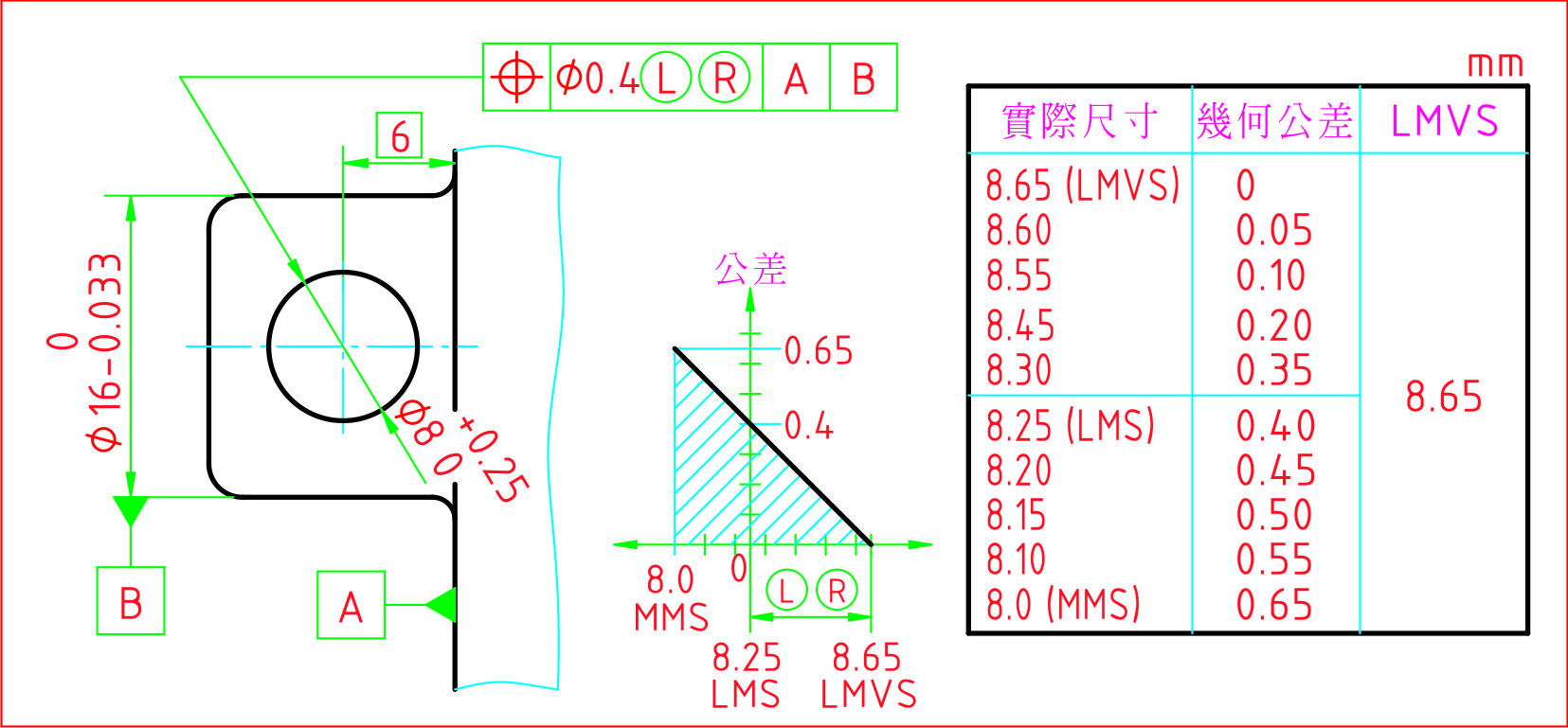 孔的合格條件:實際尺寸+幾何公差值不能大於最小實體實效尺寸(LMVS)。