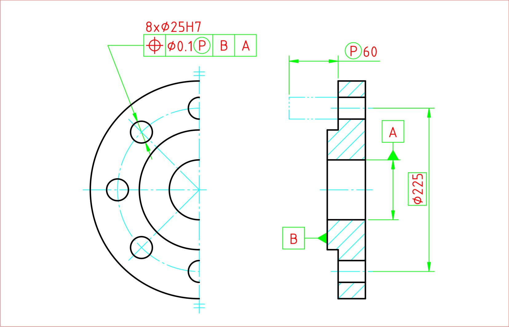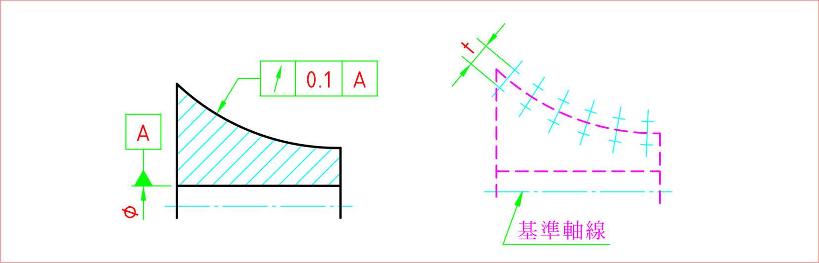 關於公差區域的數值是寬度(t)或直徑(ψt),取決於被測形態的幾何性質的不同,和設計的功能要求,而其公差區域形狀亦不同。一般公差值會標註"ψt"是所要控制的形態為導出形態(中心形態) ,其公差區域形狀為一個圓內區域,或圓柱體內的區域,才可標"ψt"。 31