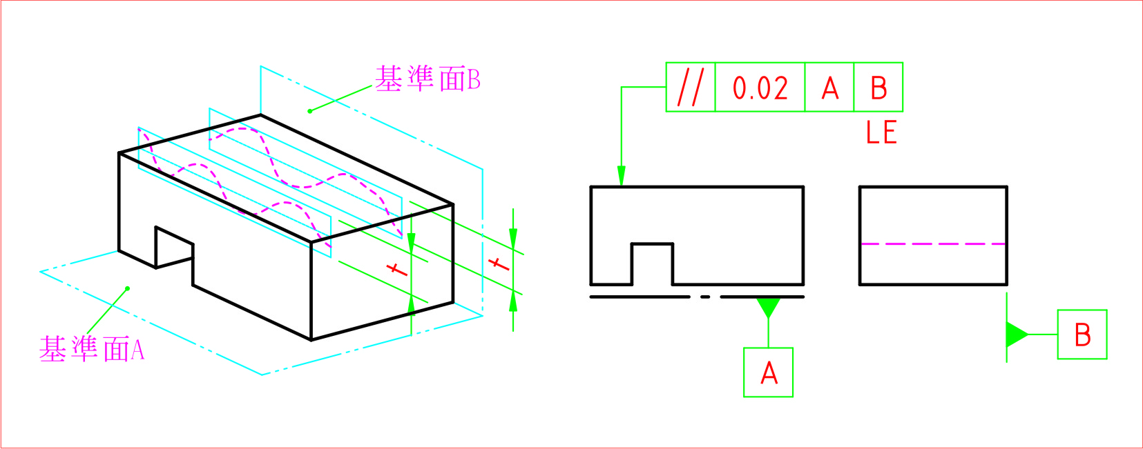 3.當空間有限或為簡化圖樣畫法時,可在被測形態上用一小黑點繪一指線,然後將公差框格的引線箭頭指向該指線的水平線上,如圖4-8所示。 13 圖4-9 被測形態為輪廓面的素線標註 4.當被測形態不是輪廓面而是輪廓面的其一素線時,應在公差框格下方註明"素線"的符號"LE"(line element)。標註時需要明確指示素線所在截面的方向,如圖4-9所示,基準面A是公差區域的方向,基準面B是確定素線所在平面的方向,所以"LE"符號就註在框格B的下方。 圖4-8