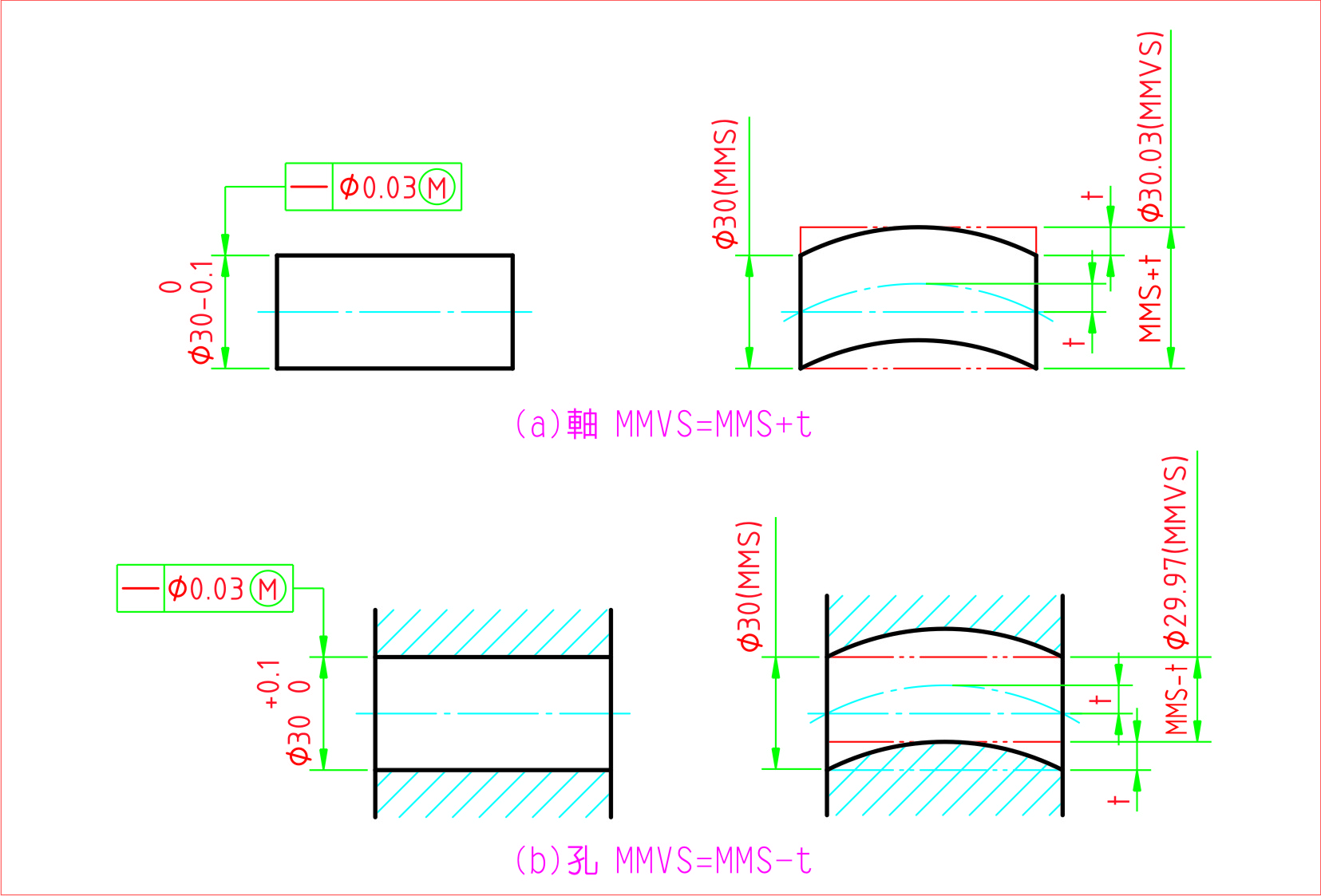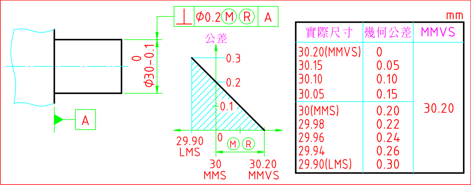 軸的合格條件:實際尺寸+幾何公差值不能大於最大實體實效尺寸(MMVS)。