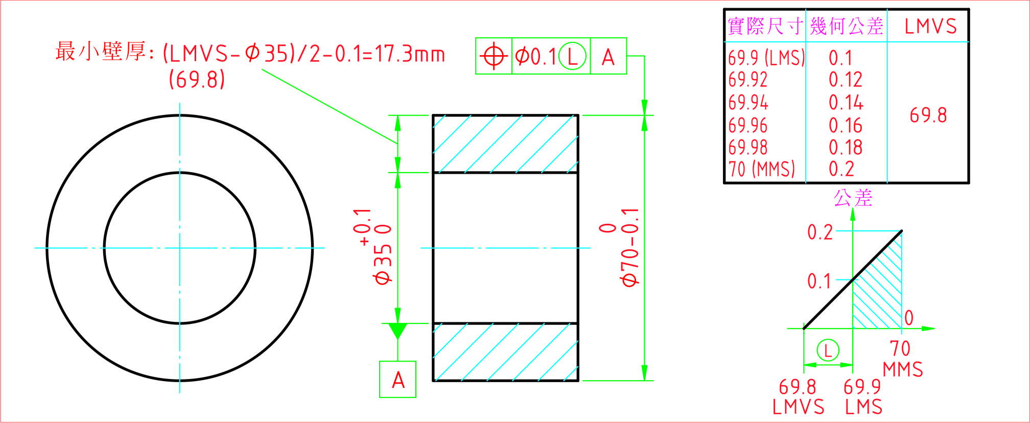 例圖4-73表示壁厚圓筒的直徑等於ψ70 的外圓柱面軸線對直徑等於ψ35 的內孔軸線的位置度公差採用最小實體要求ψ0.1。則該外圓柱面的實際尺寸必須在ψ69.9~ψ70之間,而且實際實效尺寸不能小於ψ69.8(LMVS)。 0
