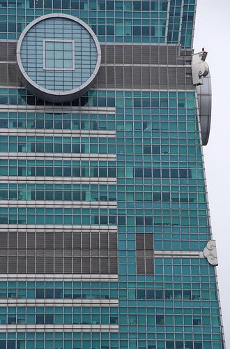 TAIPEI 101由李祖原建築師設計,為世界首創的多節式摩天大樓 第27層至第90層共64層中,每8層為一節,一共8節,有節節高升,花開富貴的意象。每八層所組成的倒梯形方塊形狀來自中國的"鼎"。 裙樓頂樓的採光罩,外型就是中國的"如意"。為了先前"金融中心"的主題,24~27層的位置有直徑近4層樓的方孔古錢幣裝飾。