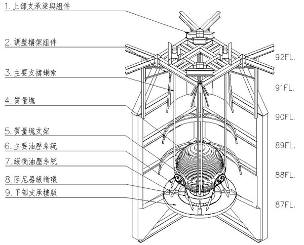 全球最大之阻尼器 為了因應高空強風及颱風吹拂造成的搖晃·大樓內設置了「調諧質塊阻尼器」,是在88至92樓掛置一個重達660公噸的巨大鋼球,利用擺動來減緩建築物的晃動幅度。