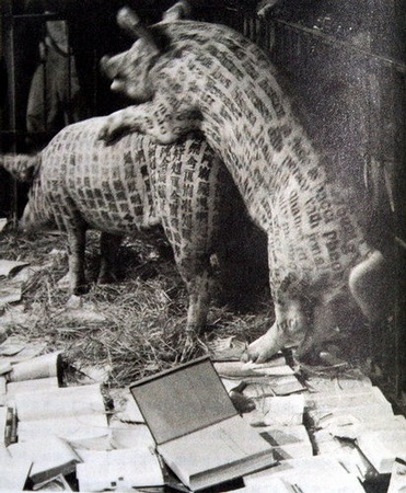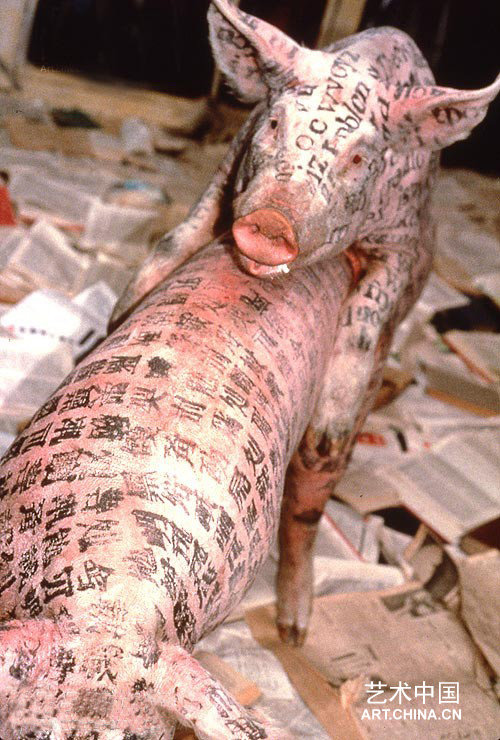 中國的藝術家徐冰的作品《一個移情例子的研究》中,一對對全身印滿字母的豬擠在堆滿書本的豬欄裡。