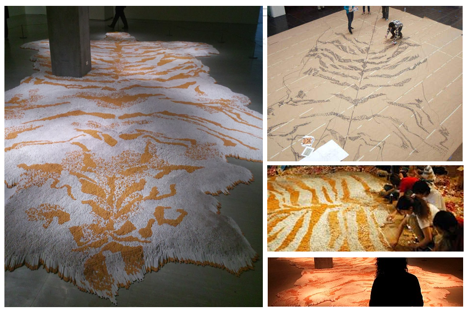 菸草計畫中,徐冰以香菸拼成的《虎皮地毯》 。以50多萬支香煙組成,也試圖思考煙草發展歷史與人類自身的問題與弱點。