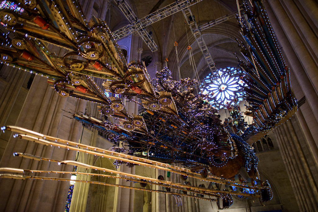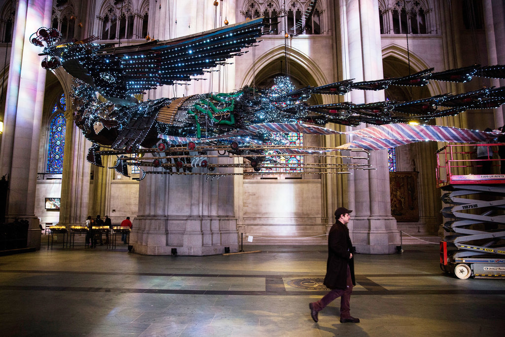 徐冰創作於2008年的作品鳳凰2014年第一次在紐約展出。一對大鳥,用建築廢料拼接而程,被懸掛在紐約晨邊高地聖約翰主教座堂宏偉的正廳之中。