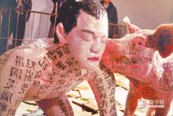 1994年行為演出作品《文化動物》的影像記錄,徐冰在公豬身上寫偽文字,在假人身上塗母豬的氣味,也寫偽文字,公豬被假人身上氣味吸引,誘發出本能慾望。