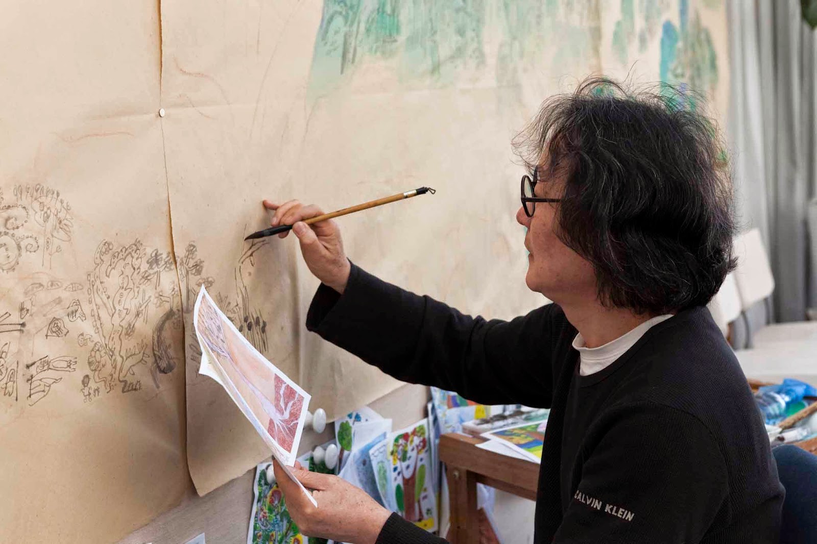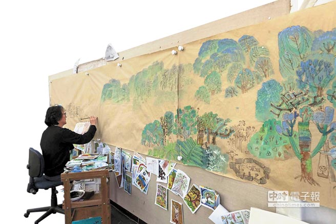 徐冰藉臨摹學童的樹,組合成大幅的森林風景畫,《木林森:青綠山水》就是引用台灣學童的樹,在臨摹的過程中,「我發現每一個孩子都在畫中藏著自己的祕密」,徐冰說。