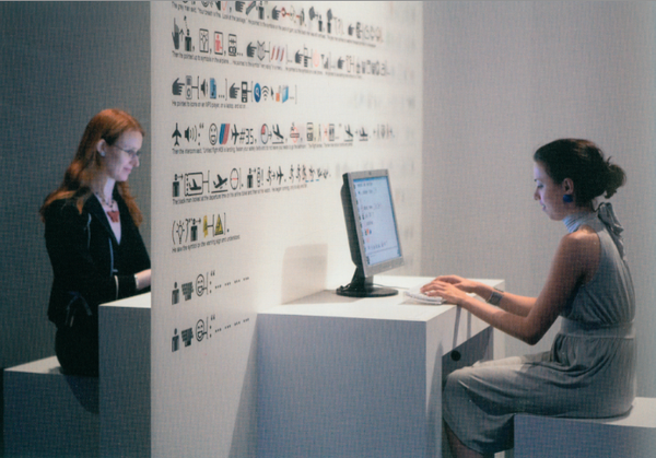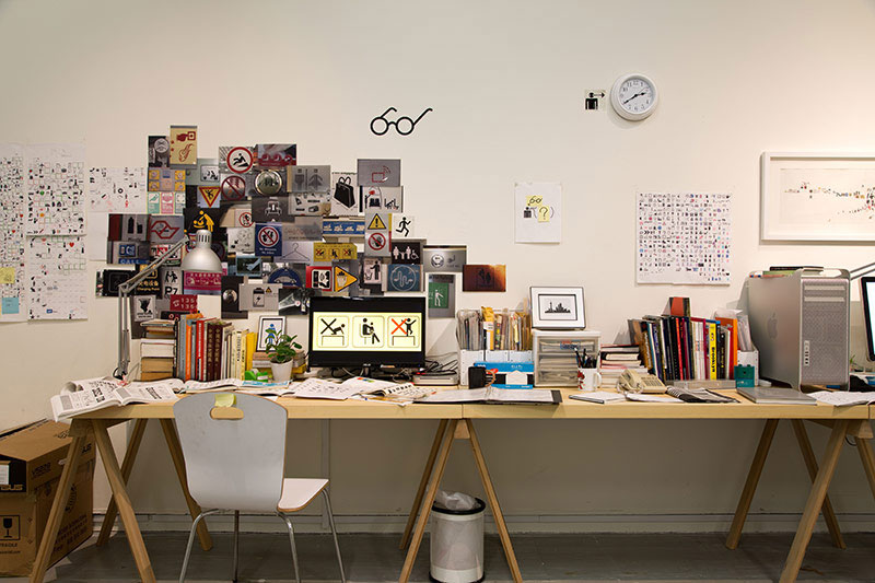 2014年北美館《地書》展出現場模擬徐冰工作室內部陳列。徐冰請人設計互動程式「字形檔」軟體,可以將文字轉化為地書的標識語言,在展場中大家都可以動手玩玩看觀眾也可透過電腦或電子產品體驗地書如何用符號說故事。