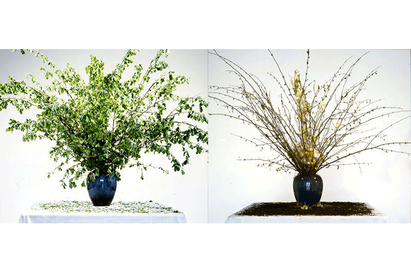 1998 年《在美國養蠶系列三:開幕式》。放置數百隻蠶於桑樹枝上,就在桑葉逐漸被啃食的過程中,有些蠶死亡了,有些則順利吐絲繭化,生命的風景與改變,清楚表達於這件作品中。