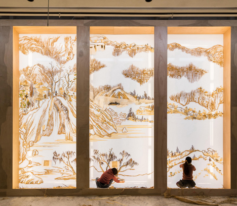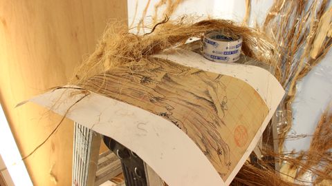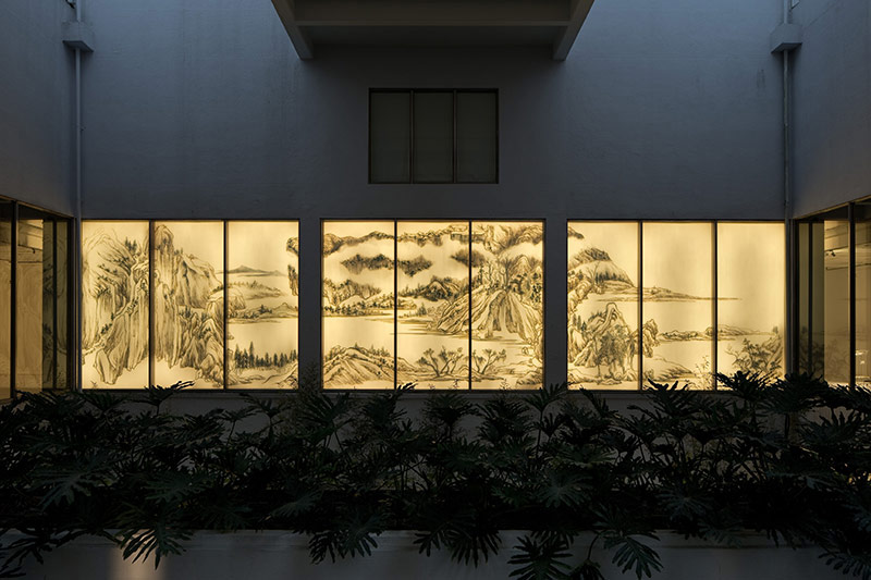 徐冰運用乾枯植物、麻線與燈箱等材料現地製作,以故宮所收藏的明代董其昌作品為藍本,他形容這是光的繪畫,將連屏裝置與美術館一樓的落地窗空間結合。