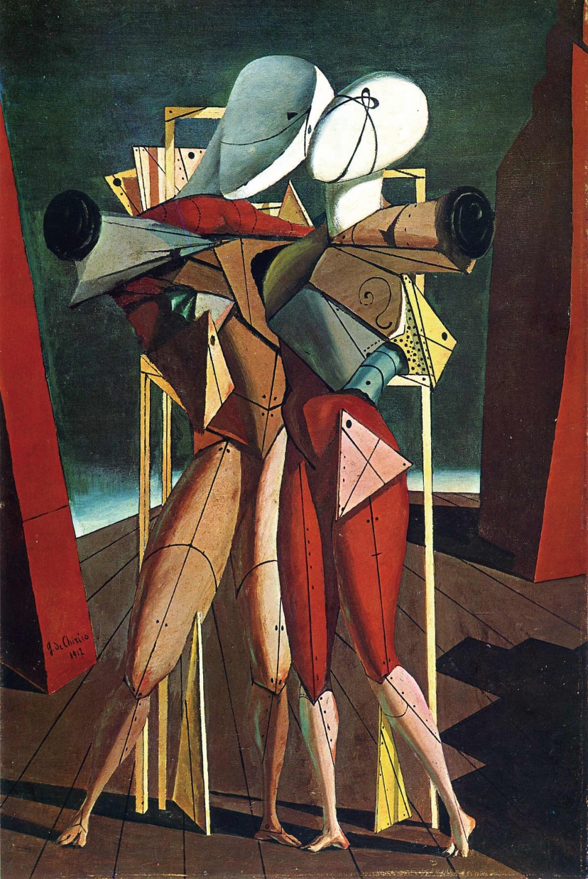 基里訶/赫克脫和安德洛碼凱/ 1917 年 油彩 畫布/ 90×60 公分 羅馬 國立現代美術館藏 造形奇特的一對人偶幾乎塞滿了整個畫面的空間。人偶的身體是用基里訶的「形而上」概念所表現,也就是完全根據自己的想像來進行創作,所畫的物品、場所均與現實相去甚遠。他常用人偶來創作,將想像和夢幻的形象,與日常生活事物或古典傳統融合在一起,使現實和虛幻合而為一。基里訶的畫作充滿一種不安的詭異氣氛,這種象徵性的幻想藝術,後來也被稱為「形而上繪畫」,是達達主義及超現實主義藝術的先驅。