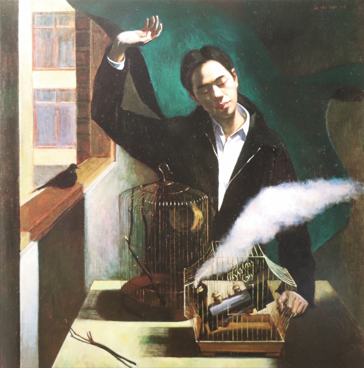 朱友意(1967-)/被鄉愁襲擊的畫家/ 1997 年 油彩 畫布/ 120.5×120 公分/臺北市立美術館藏 改變物像大小重新組構,形成一種奇幻與新奇的畫面,訴說畫家的鄉情與焦慮。
