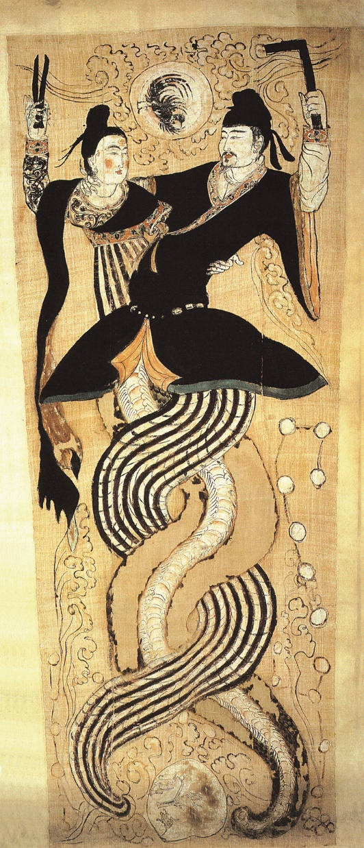 伏羲女媧圖/唐代/水墨設色 絹/ 220×116 公分 新疆 維吾爾自治區博物館藏 神話中的女媧即是一個具有蛇身的神祇,畫面上的男女相視互擁,下半身均為蛇形且相互交繞,生動傳神,這是以唐代當時的人物造形為摹本,表現上古神話傳說中人類始祖的形象,此外,畫的上方繪了代表太陽的三足鳥—赤烏,下方則繪有代表月亮的蟾蜍,這也是一幅具有象徵寓意的畫作。