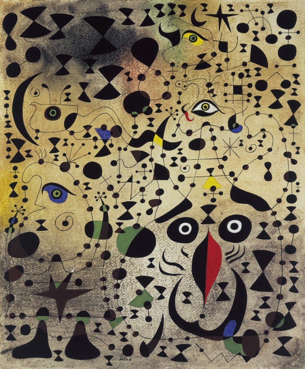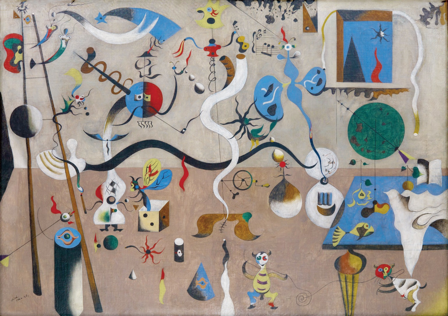 米羅/小丑狂歡節/ 1924-1925 年/油彩 畫布/ 66×93 公分 私人收藏 米羅創造許多不知名的生物縈繞在畫面中,在一個奇特的室內空間舉行著狂熱的集會,各式各樣的野獸、小動物、有機物,全都十分快樂。作品並沒有什麼特別的象徵意義,畫家只是充分地描繪了一種愉快的夢幻形象。