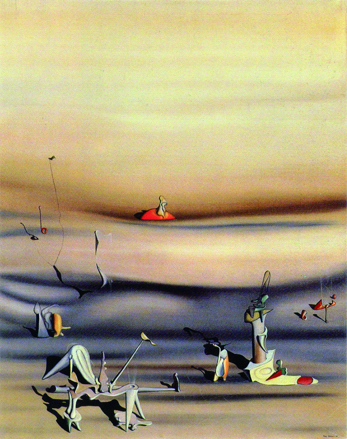 坦基/黃昏/1937 年/油彩 畫布 92×72 公分/巴黎 龐畢度中心藏 作者在狀似柔軟扭曲的空間裡,創造出數個不可名狀的生物,使觀者彷彿置身在夢境般。雖然是無法辨識的物體,卻似乎有著生命般的活力。