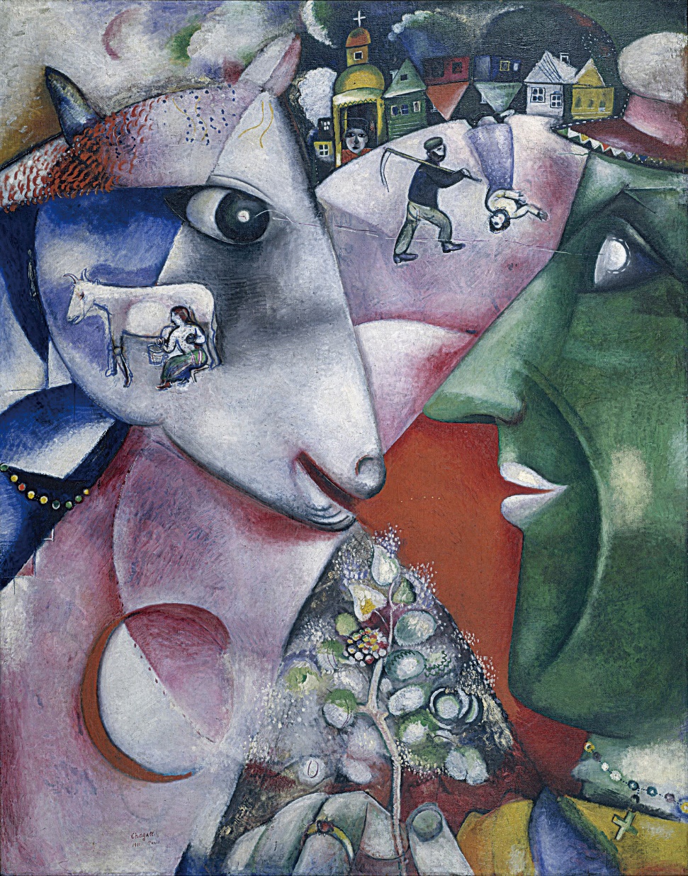 夏卡爾(Marc Chagall, 1887-1985) 我與我的村子/ 1911 年/油彩 畫布 192×151 公分/紐約 現代美術館藏 作者將過去腦海中的回憶影像,重新組合成一件心靈意象的作品。在構圖中描述了家鄉的景象,夢幻的氣氛籠罩著全畫,也吐露思鄉之情。