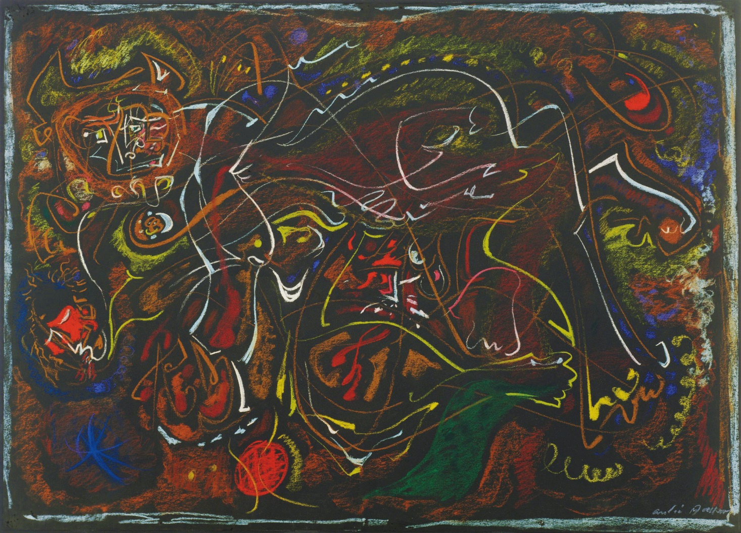 馬松/巴西拔埃/ 1945 年 粉蠟筆 紙/ 69.9×96 公分 紐約 現代美術館藏 創作出於感性隨機的表現,沒有事先的計算與設計,隨著感情與意念描繪流動的形色世界。 喜 愛 希 臘 神 話 的 馬 松, 以 巴 西 拔 埃(Pasiphae)與化身公牛的丈夫之戀情為創作內容。