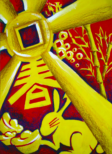 學生作品 畫面具有象徵意涵的元素如:元寶、銅錢、春字、竹子等。
