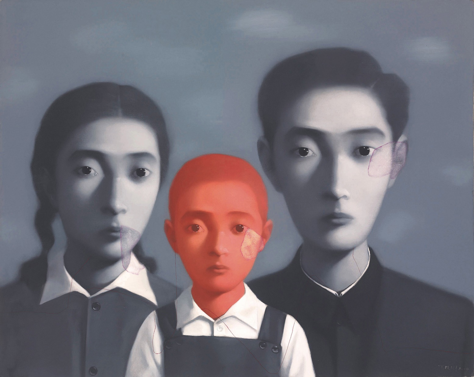 張曉剛(1958-) 大家庭系列/ 2004 年 油彩 畫布/120×150.2 公分 私人收藏 微微拉長的臉、表情呆滯、眼神空洞與灰色調的畫面是作者的特色。以家庭為主題,呈現如同黑白照片般的古舊,並帶有不正常的光澤與色彩,或許暗示著作者家庭離散破碎的經驗,也代表他那世代中國家庭集體的悲哀與記憶。