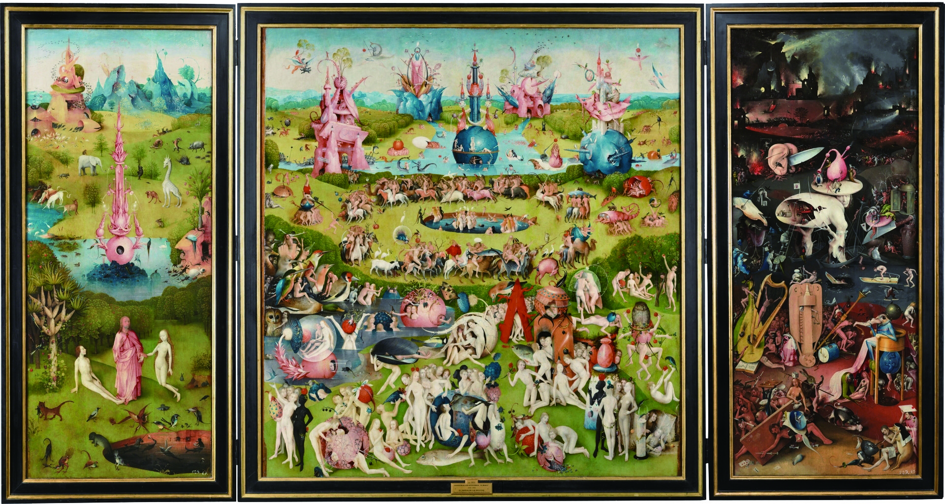 波希/樂園/ 1500-1510 年/油彩 木板/中央主板 220×195 公分,左右側板 220×97 公分 馬德里 普拉多美術館藏 左側板描繪天堂景象,畫中耶穌向亞當與夏娃教化,世界一片寧靜安詳;中間主板描寫人世間的原罪,前景是沉淪於肉欲歡樂的男女,中景是騎在眾多動物身上圍著青春之泉的好色之徒,背景有矗立在水中的奇怪藍色球體,天空則飛翔著不明飛行物,此幅描繪人世的善惡好壞,熱鬧而紛亂。右側象徵地獄場景,呈現黑暗恐怖的景象,腹部裂開的蛋形怪物正側著頭凝視眾人,人頭上方圓盤有群怪人圍繞著像是風笛的物體在走動,前景有許多酷刑正在進行,背景則是黑暗中毀滅的城市。波希這種獨特的表現風格深受現代許多超現實主義愛好者的喜愛。