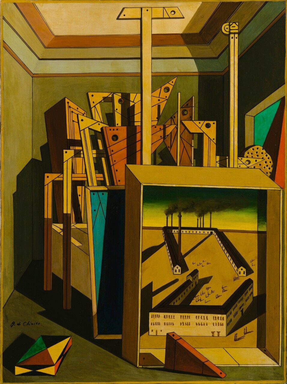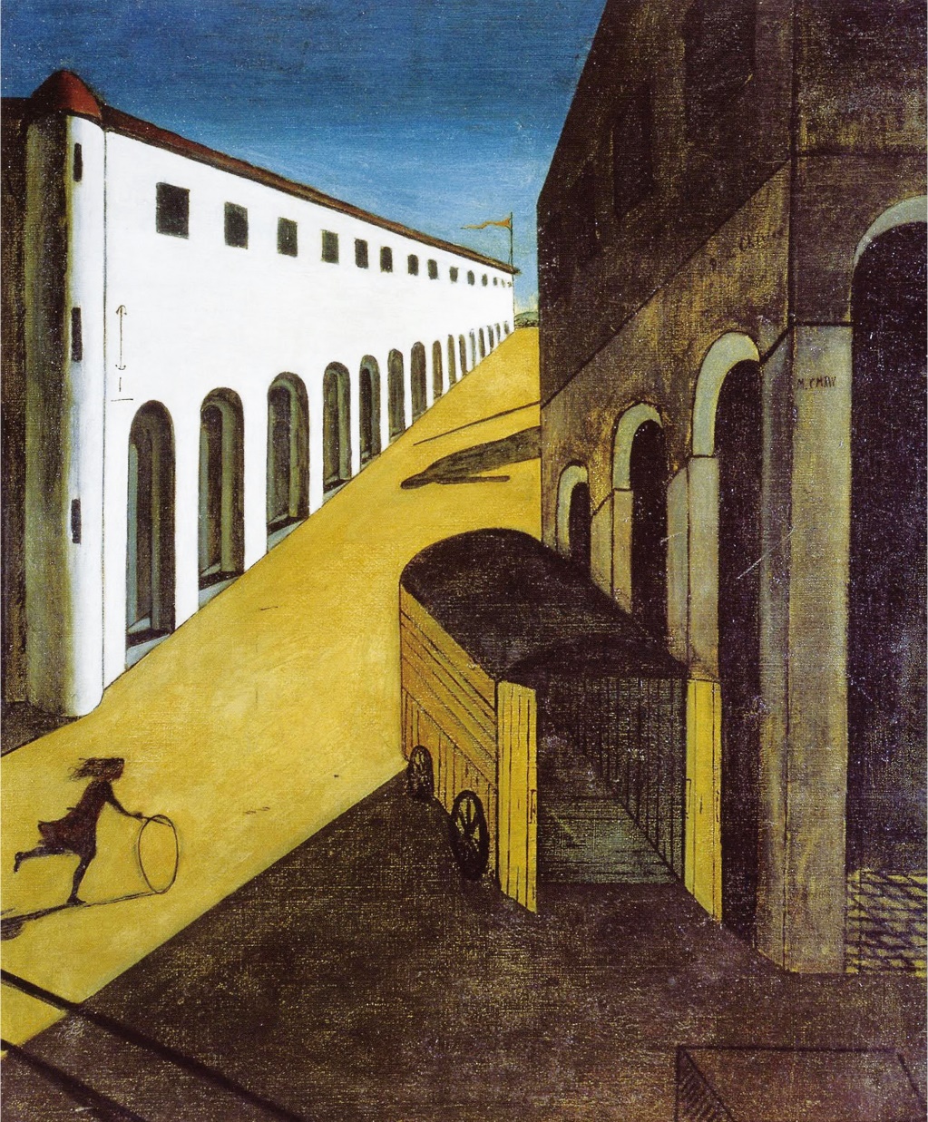 基里訶(Giorgio de Chirico, 1888-1978) 一條街道的憂鬱與神祕/ 1914 年 油彩 畫布/ 92×73 公分/私人收藏 左右建築的透視明顯不同,空間的怪異產生奇幻的畫面,一位少女玩著輪圈從左下方前進,然而在遠方街道盡頭出現一個巨大人影,使得氣氛頓時變得陰森詭異。