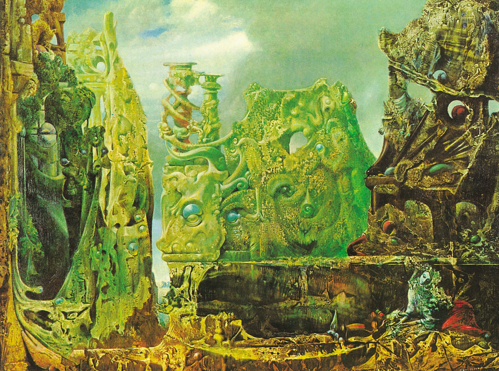 恩斯特/沉默的眼睛 1943 年/油彩 畫布 108×141 公分/聖路易 華盛頓大學美術館藏 斑駁怪誕的岩石因為加入許多隻眼球,使得原本冰冷的石壁產生出許多張具生命力的臉龐,猶如人類惡夢中的恐怖景色,表現出人類的無助與恐懼。作者以其創造的超現實空間,呈現細密奇幻的樹枝與石壁,畫面的質感層次相當豐富。
