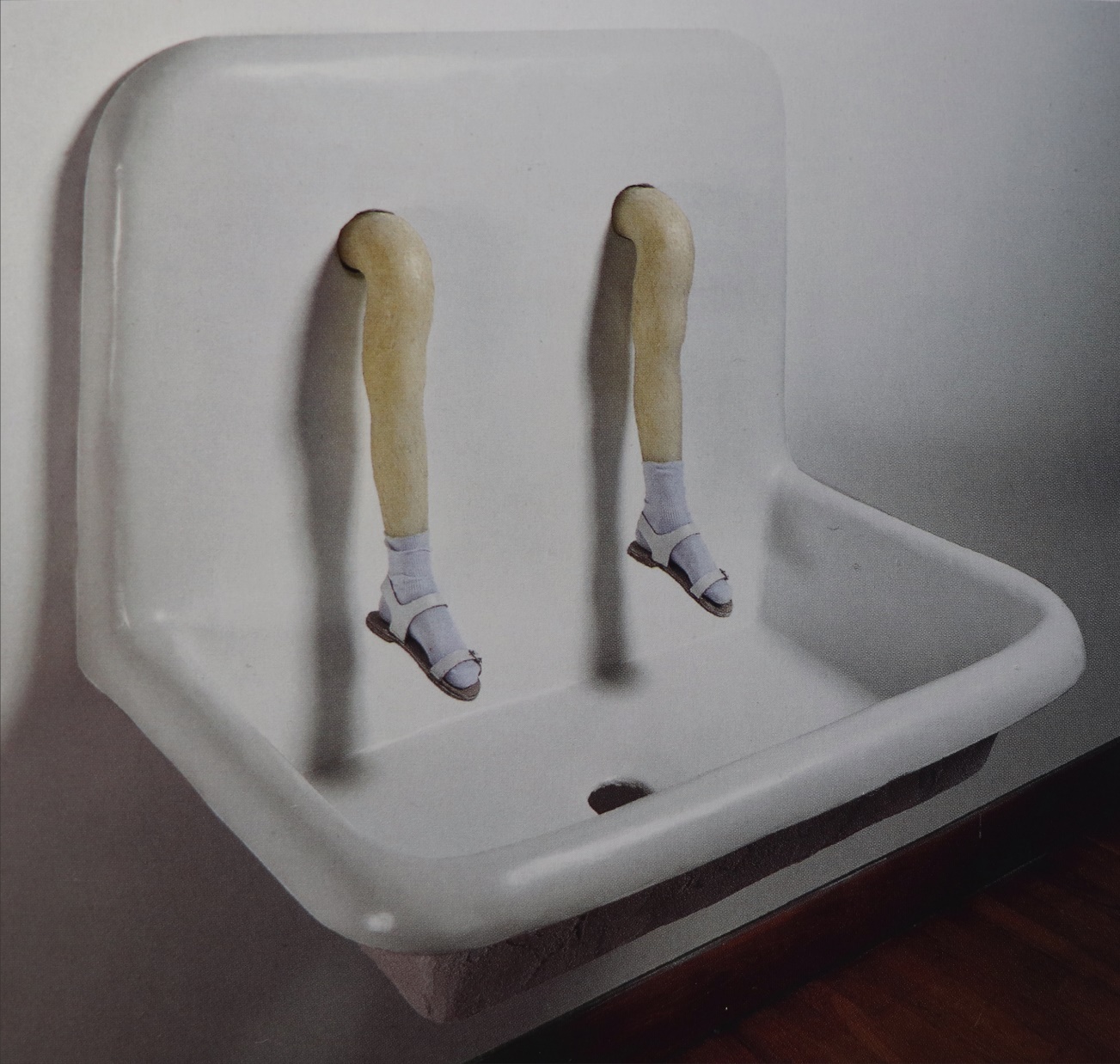 戈貝爾(Robert Gober, 1954-)/無題 1999 年/塑膠 毛髮 陶瓷 皮革 寬 101 公分 美國 費城藝術博物館藏 將人體腿部與洗手臺結合,創造出一種奇異的景象。腿部成為固定的裝置,洗手臺的孔洞似乎成了人體的排泄孔。