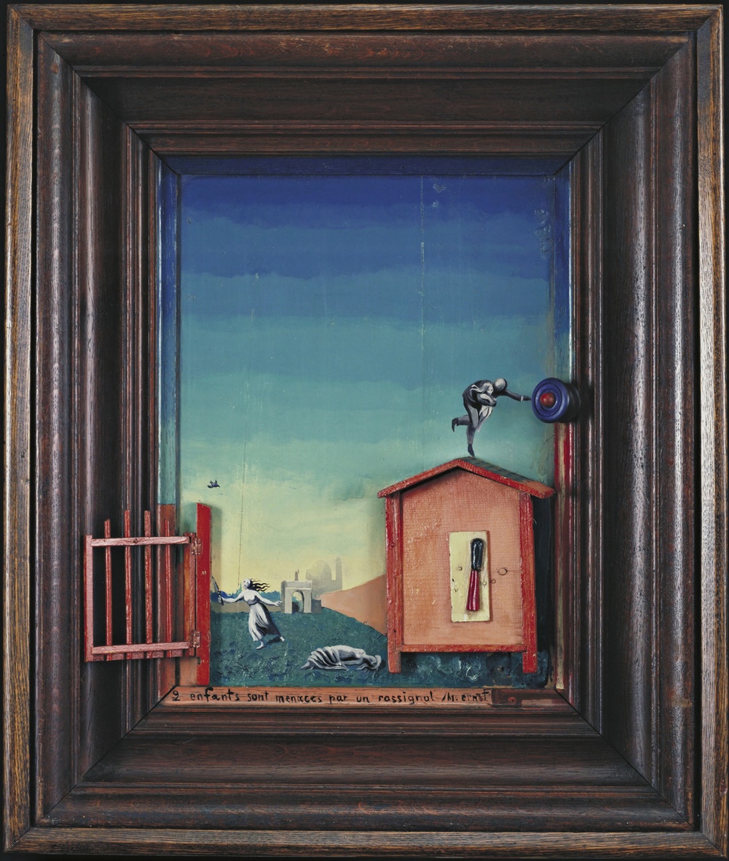 恩斯特(Max Ernst, 1891-1976) 受到夜鶯威脅的兩個孩子/ 1924 年/油彩 木框 69.8×57×11.4 公分/紐約 現代美術館藏 恩斯特在他的達達主義創作中,以實物拼貼結合彩繪,表現具有超現實主義傾向的作品。此作外型特別,名稱似乎具有隱喻性,描繪平靜的農莊,卻因小小的夜鶯帶來驚擾,內容表現得相當超脫現實。恩斯特是超現實主義最具代表性的藝術家,從達達主義到超現實主義,他一直是團體裡的領導人物,也是堅守超現實主義理論創作的藝術家。
