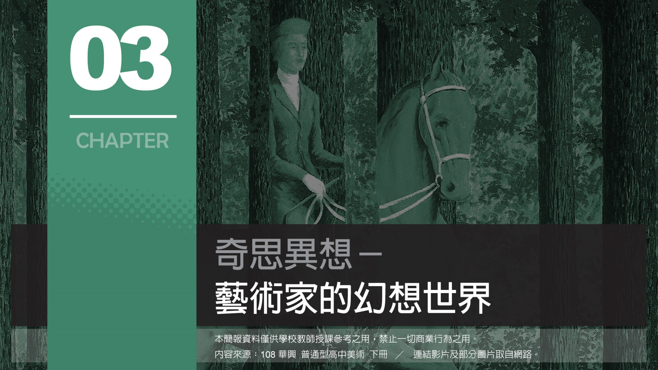 ❶你比較喜歡古典的超現實主義或有機的超現實主義的表現方式?請分享喜歡的原因與藝術家。 ❷尋找臺灣的超現實主義藝術家,並分享他的創作特色。 ❸超現實主義表現的形式擴及各種藝術領域如戲劇、舞臺、攝影、電影、建築、雕刻等。請同學蒐集具有超現實主義風格的其他藝術領域,並分享其表現的方式與特點。